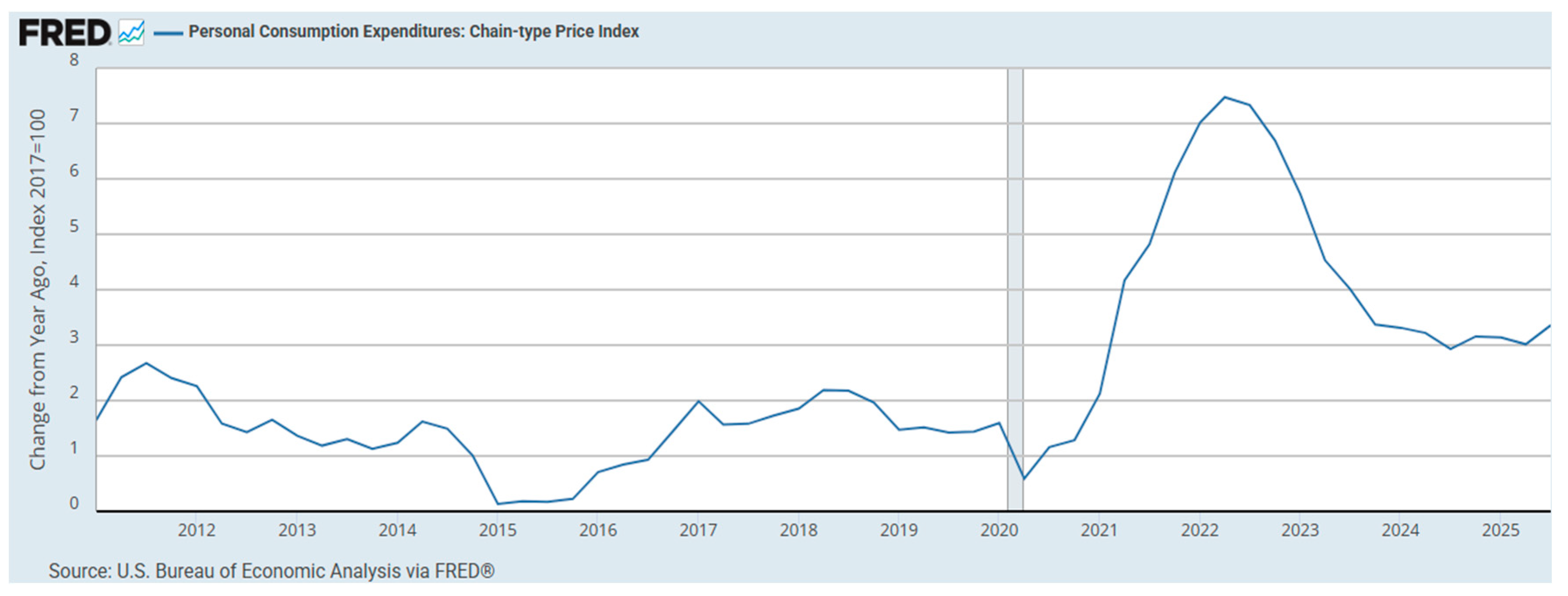 Figure 4. Personal Consumption Expenditures: Chain-type Price Index. Shaded area indicates recession. Source: Federal Reserve Bank of St. Louis FRED.