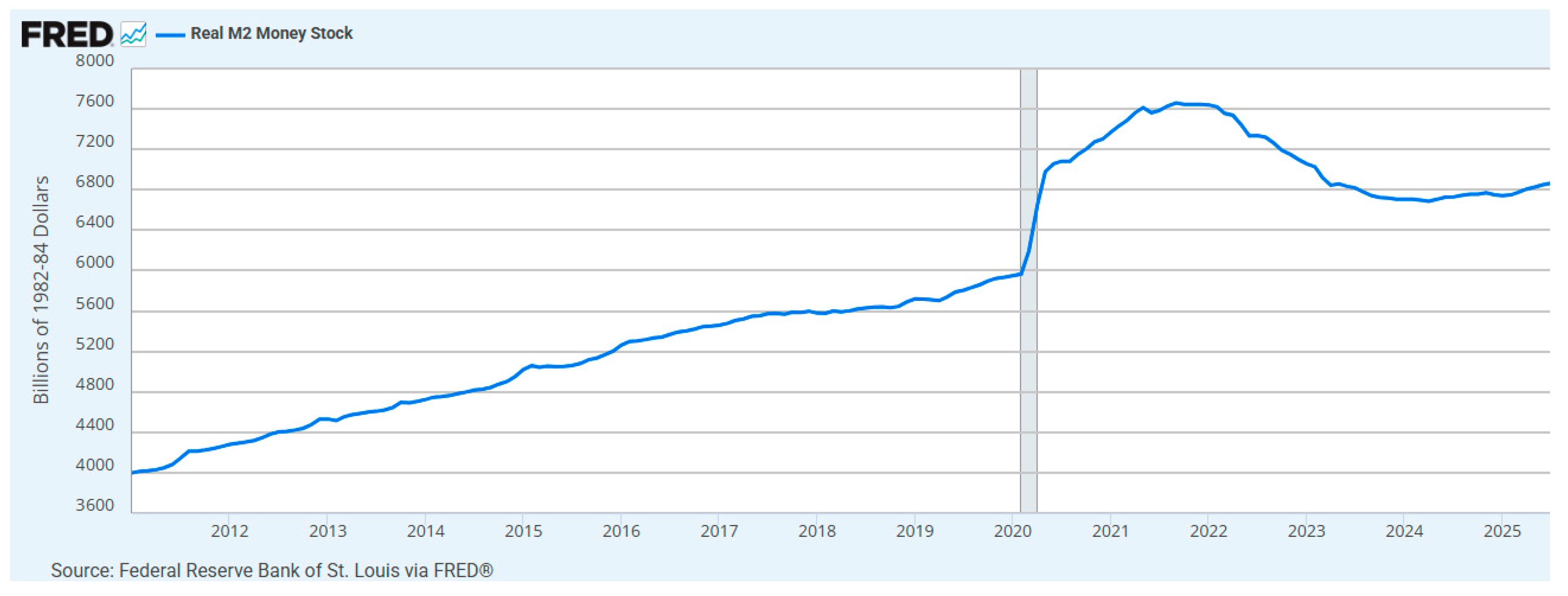 Figure 3. M2 and Trend Dashed line is based on 1999-2019 trend. Source: Reid (2025) and Federal Reserve Bank of St. Louis FRED.