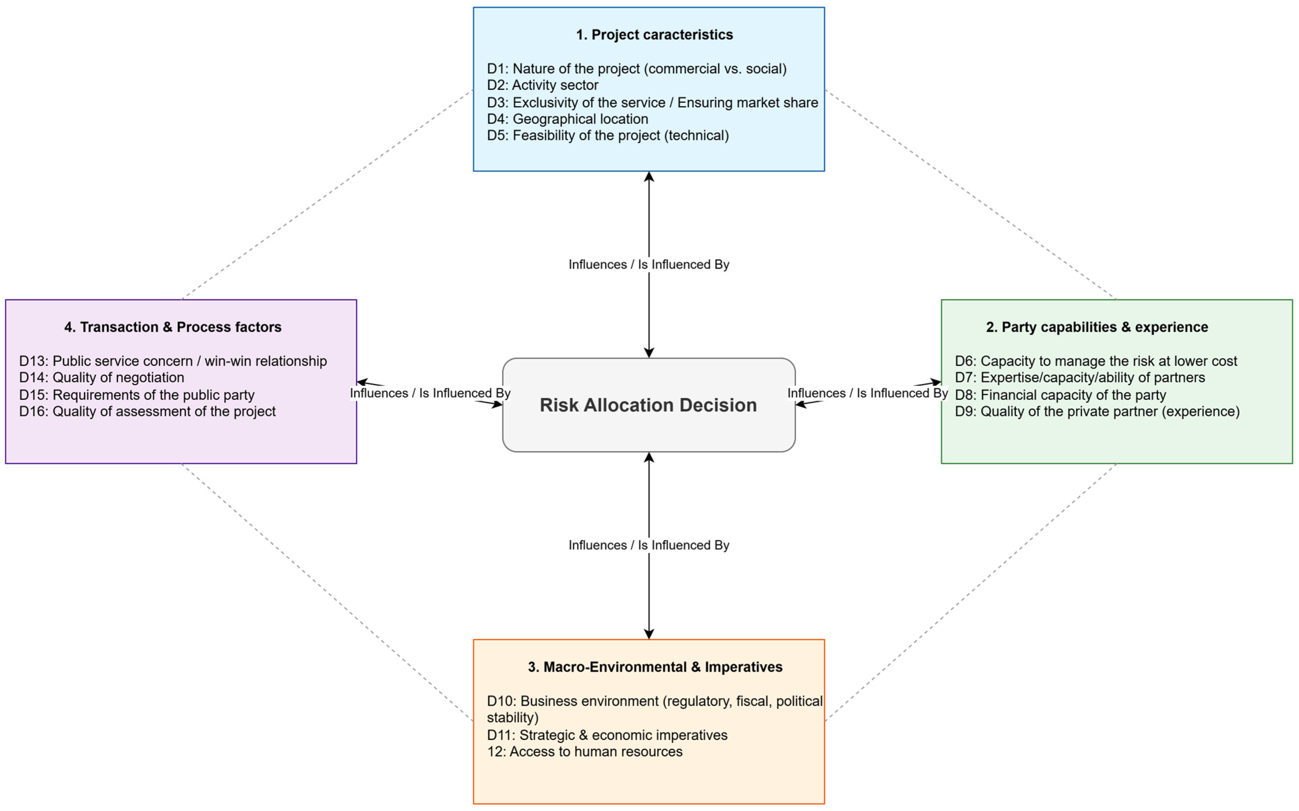Figure A6). The analysis shows that risk allocation in PPPs is a complex decision that depends both on the inherent attributes of the project and the external factors of the environment. Main factors influencing the decision are “the nature of the project (commercial vs. social)”, which determines the financial risk that can be taken; “the activity sector”, which establishes the sector-specific risk standards; and “the stability of the business environment”, which impacts the investor’s confidence. In addition, factors related to the process, such as “negotiation quality” and “project assessment rigour”, have a significant influence on the final risk assignments. Finally, the main idea still revolves around assigning the risk to the “party best able to manage it at the lowest cost”, considering each party’s “expertise and capacity”.