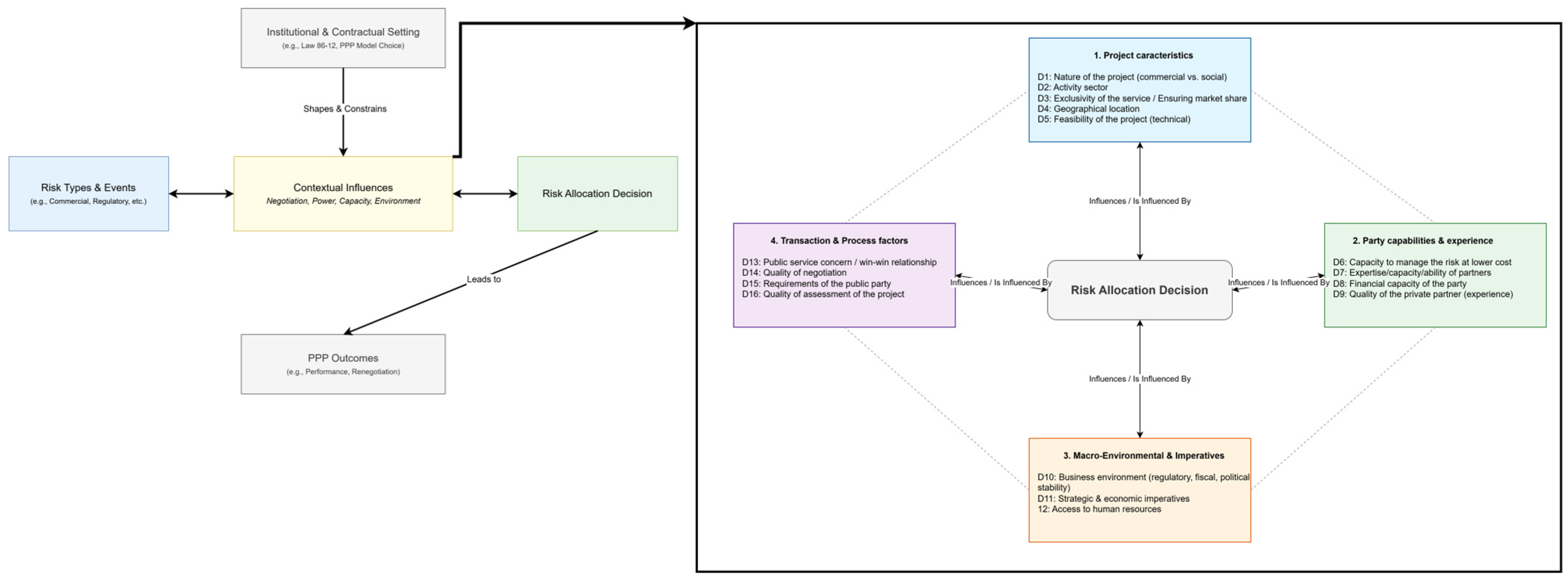 By combining the different elements, our study reveals risk allocation in Moroccan PPPs as a socio-political process deeply rooted in the context rather than a matter of technical optimisation. It is a legal-financial-framed process where discourse sets the field, a multidimensional determinant force field shapes the negotiation, and the emotions underneath influence the behaviour of the actors involved.