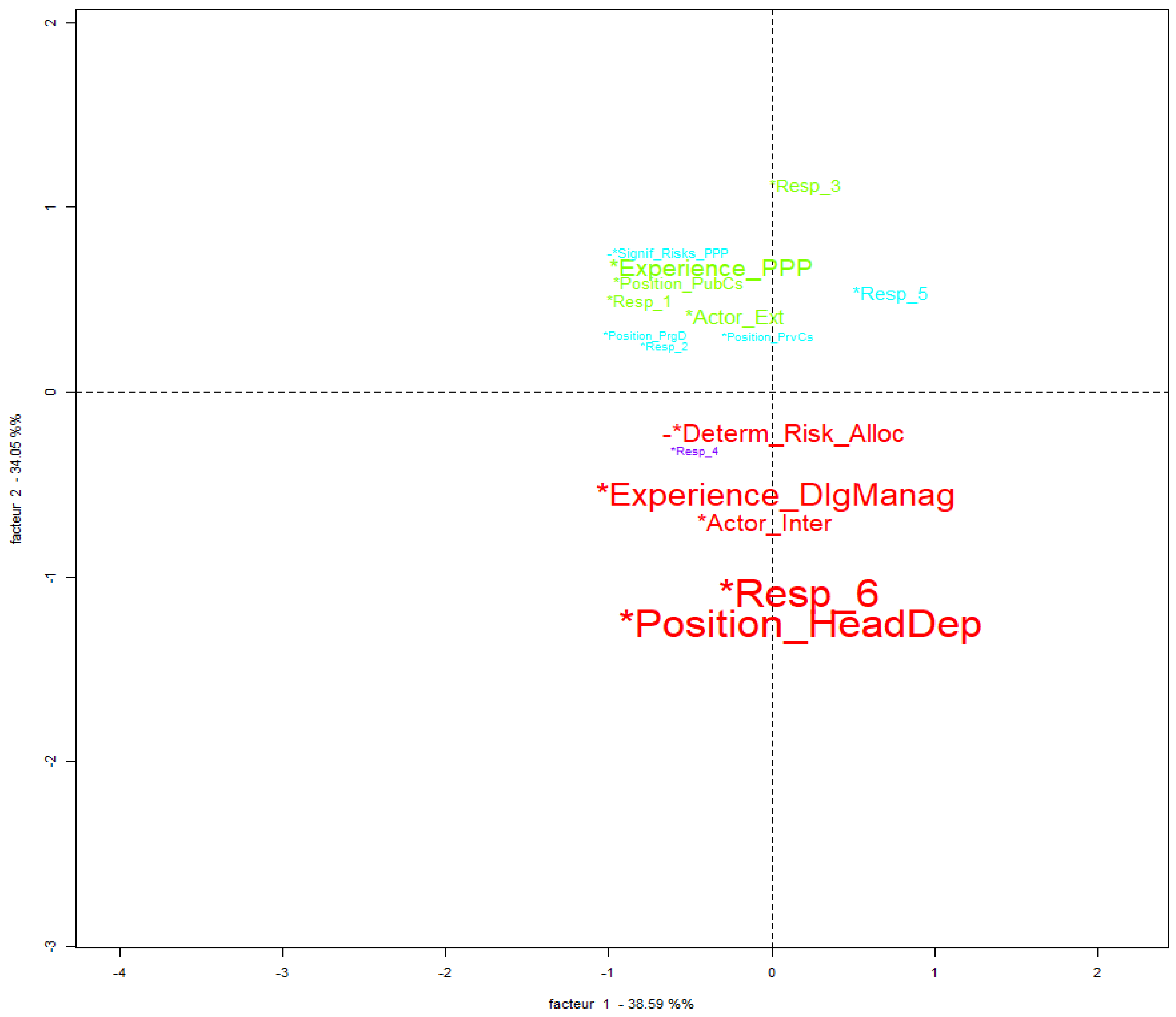 After analysing the DHC of the corpus, we have performed an analysis of the active forms only related to the form ‘risk’ (in Class 3). We have selected the variable of analysis, Responsible, named (*Resp). The result is the graph below, which highlights the significant risks associated with PPP projects. Risks were ranked by the frequency with which interviewees explicitly identified and elaborated on them as a primary concern.