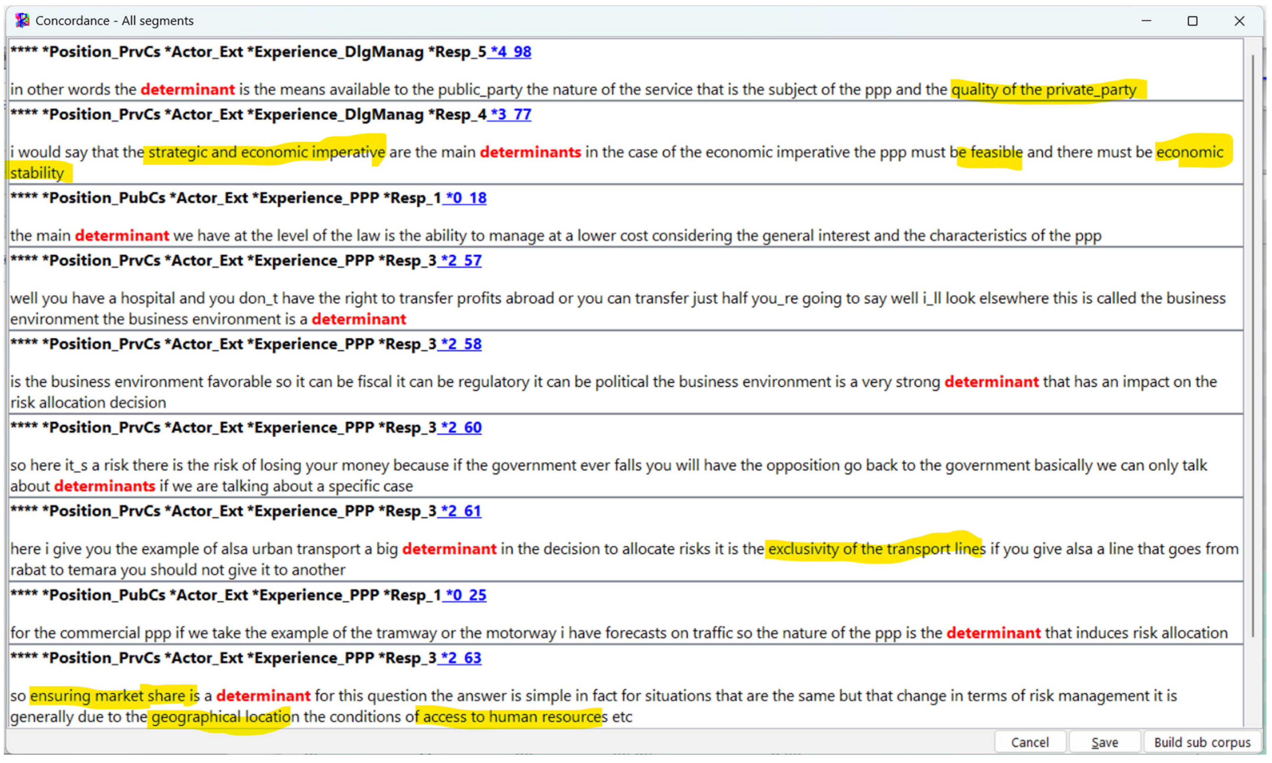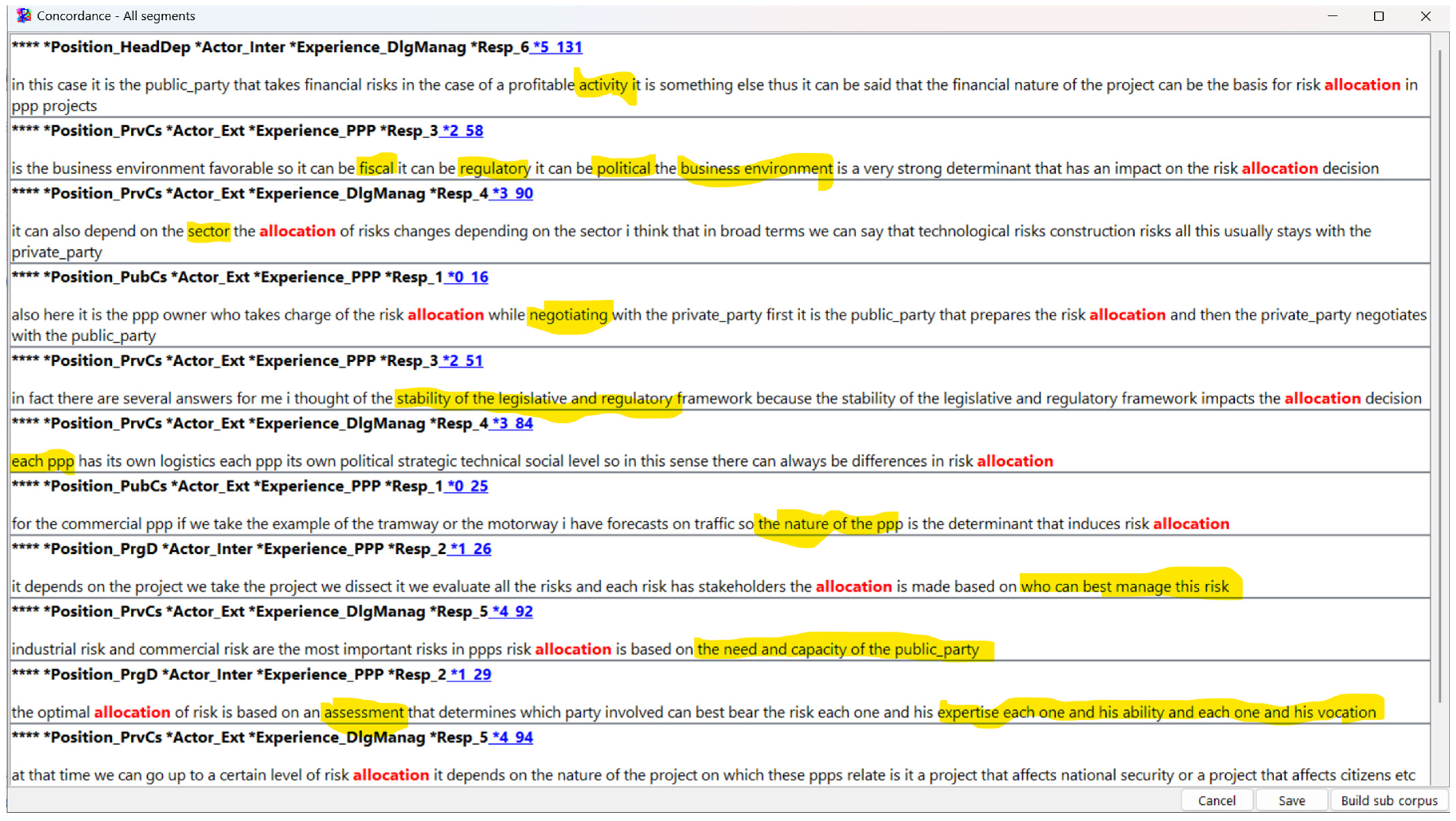 After analysing the classification of the corpus of interviews, we will now identify the most significant risks in PPP projects, followed by the determinants of the risk allocation decision between the public and private parties.