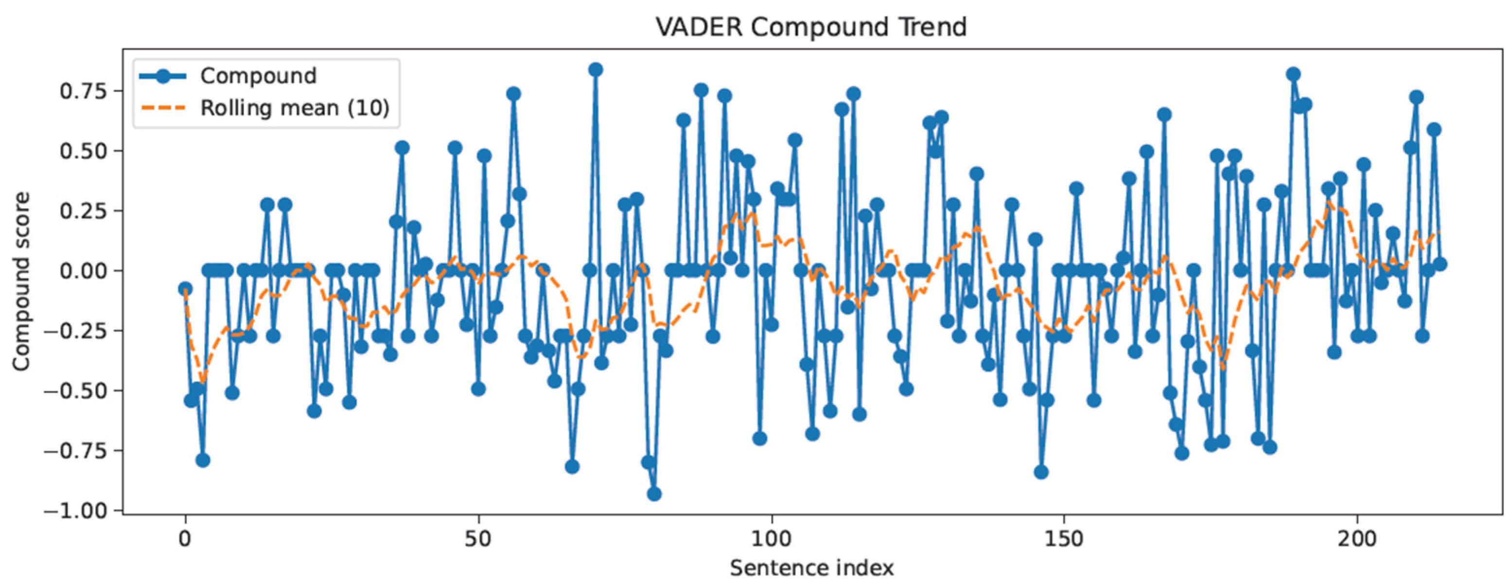 The sentiment analysis provides an additional interpretative layer to the qualitative material by revealing how interviewees construct and emotionally frame their understanding of public–private partnership (PPP) arrangements. Across the dataset of 215 sentences, the results indicate a predominantly neutral affective tone, with VADER scores—which produce compound scores ranging from −1 for most negative to +1 for most positive—showing very high neutrality (87 per cent) and only a slight negative inclination in the average compound value (–0.0488) (see