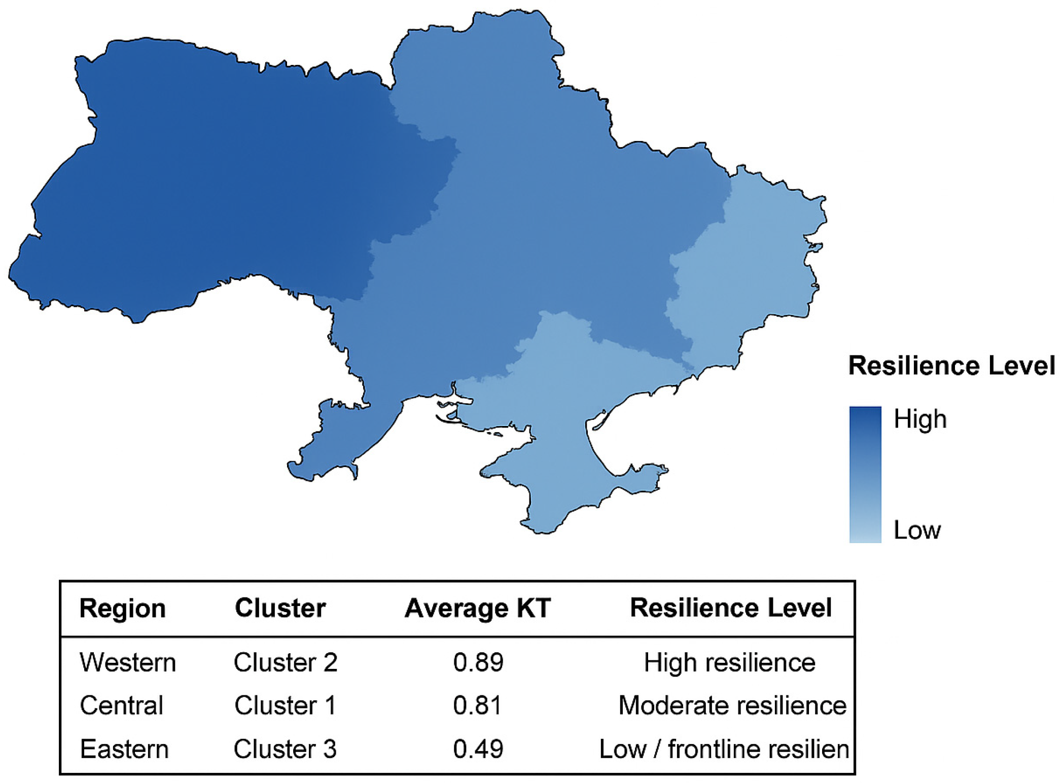 | Cluster 3—Low Resilience (Eastern Region, KT ≈ 0.49) | Low access to financing, high debt load, low liquidity, high regional risk exposure | Loss of markets, logistical disruptions, infrastructure damage | Financial recovery and cooperative integration | Introduce government guarantees for SME loans and targeted microfinance programs; develop cooperative networks for joint resource use; apply digital tools for supply chain and inventory management; create regional crisis consulting centers at OVAs and Chambers of Commerce |