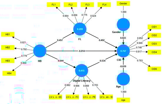 Hypothesis testing is conducted to determine whether the proposed correlations between the model’s constructs are statistically significant. Before proceeding with testing the measuring model for the digital literacy dimensions and variables, it is crucial to ensure validity and reliability in the structural model analysis. This involves assessing the constructs and indicators to confirm that they adequately measure the intended latent variables, using criteria for reflective or formative measurement models. After that, hypothesis testing is conducted using p-values and t-statistics. The alternative hypothesis is accepted if the p-value is less than 0.05, indicating a substantial association between the constructs. The researchers also examined the coefficient of determination (R2) reported in the structural model assessment to evaluate predictive power. In an order construct, an indicator is considered to adequately represent its construct if the p-value < 0.05, indicating statistical significance. Additionally, the absence of multicollinearity is ensured by examining the Variance Inflation Factor (VIF); if the VIF is less than 10, there is no multicollinearity among the indicators.