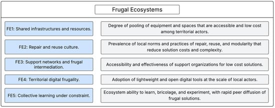 From this perspective, a frugal ecosystem can be defined as a territorial configuration of actors, assets, and rules that facilitates pooled access to design, manufacturing, and learning resources, institutionalizes norms of sobriety such as repair, reuse, and modularity, and orchestrates supports including hubs, incubators, public schemes, and lightweight digital tools in order to lower experimentation costs and diffuse solutions considered sufficient for local needs. This definition is consistent with four structural pillars (shared infrastructures and resources; repair and reuse culture; support networks and frugal intermediation; territorial digital frugality) and with a fifth, transversal latent dimension—collective learning under constraint, that reflects the ecosystem’s emergent learning-and-diffusion capacity. This definition aligns with research linking frugality and sustainability, with recent frameworks on entrepreneurial ecosystems, and with multi-level measurement toolkits (Prokopenko et al., 2025).