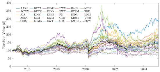 For benchmarking purposes, we construct an equally weighted portfolio (EQW) of the 29 ETFs. The EQW assumes a 100-dollar long-only investment in each ETF as of 10 December 2014 and is rebalanced daily to maintain equal weights across all funds. By definition (Markowitz, 1952; Sharpe et al., 1999), an EQW is a simple, non-optimized allocation that invests the same proportion of capital in each asset, providing a neutral, diversified baseline against which we can evaluate the gains from optimization.