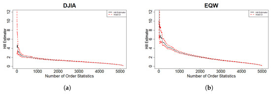 For each return series in our study, we compute the Hill estimator over an increasing number of upper order statistics and plot the resulting Hill curve together with Wald confidence intervals. The initial part of each curve typically shows substantial fluctuation because it is based on only a few extreme observations; as more order statistics are included, the curve tends to stabilize, indicating the range in which the tail index is reasonably estimated. Appendix B reports Hill plots for all 29 ETFs, while Figure 2 compares the DJIA and the EQW portfolio.