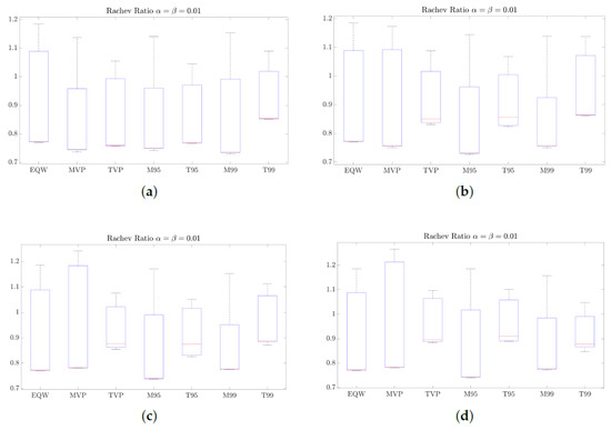 Figure A4. Boxplots of Rachev ratio (95% and 99%) for the 29 individual Asian ETFs. (a) Rachev ratio 95%. (b) Rachev ratio 99%.