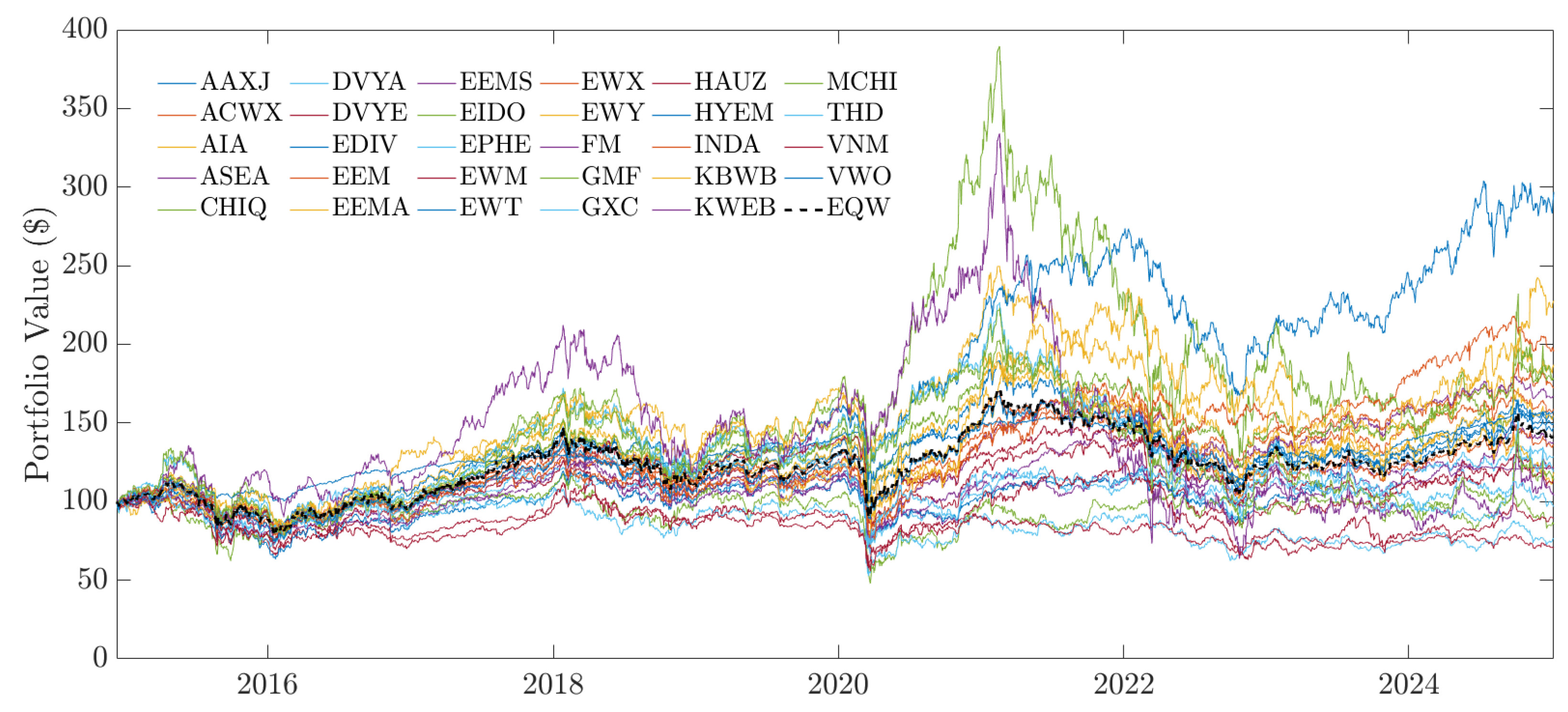 Some country-specific funds such as EWT (Taiwan) and INDA (India) outperform the EQW over the long run, others, including VNM (Vietnam) and HYEM (emerging-markets high-yield bonds), lag behind. The COVID-19 market crash of early 2020 generated a sharp drawdown across all ETFs, but both the EQW and most constituents subsequently recovered, underscoring the resilience of diversified exposure to Asian and emerging markets.