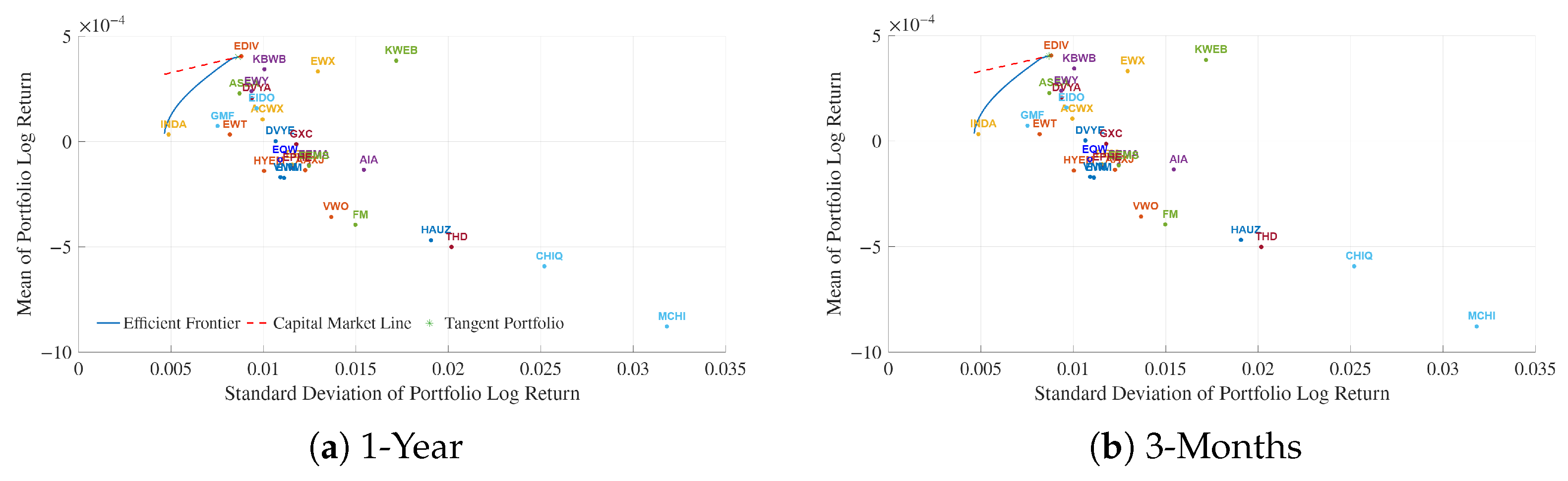 Figure 3 shows the Markowitz efficient frontiers constructed using the one-year and the three-month Treasury yield as the risk-free rate. Each plot illustrates the trade-off between risk, measured by the standard deviation of portfolio log returns, and expected return, represented by the mean of portfolio log returns. The blue curve traces the efficient frontier, while the red dashed line represents the capital market line that is tangent to the frontier at the optimal, or tangent portfolio. Both graphs exhibit the typical upward-sloping convex shape, indicating that higher returns are associated with higher levels of portfolio risk. The similarity between the two frontiers suggests that the choice between the one-year and three-month Treasury yields has minimal effect on the resulting efficient frontier or the tangent portfolio position.