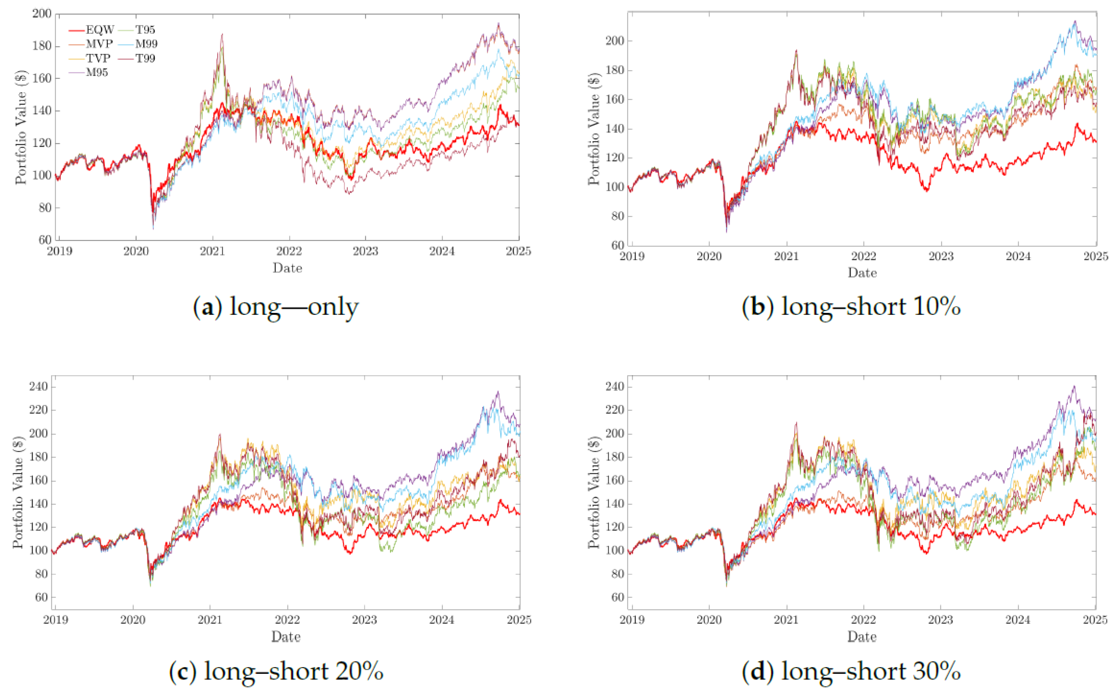 2021) note that the EQW portfolio is inherently long-only and is typically excluded from long–short analyses, but it is retained here as a consistent benchmark to illustrate relative performance across all strategies. The long-only strategy exhibits smoother trajectories with moderate gains, whereas the introduction of leverage in the long–short setting amplifies both returns and volatility. As leverage increases from 10% to 30%, portfolios experience progressively greater dispersion, demonstrating that while moderate leverage (10–20%) enhances performance without destabilizing the portfolio, higher leverage (30%) introduces pronounced fluctuations and sharper drawdowns during adverse market conditions. In the long-only strategy, M95 achieves the strongest terminal value, with T95, T99, TVP, and M99 clustered closely behind. Introducing short exposure and moderate leverage (10–20%) lifts the performance of the more return seeking portfolios (T95, T99, TVP), though at the cost of greater volatility. At higher leverage (30%), dispersion widens further as risk focused portfolios (M95, M99) maintain smoother growth and better downside resilience. Overall, leverage amplifies both returns and risks, with moderate levels improving performance efficiency and excessive leverage magnifying fluctuations and drawdowns.