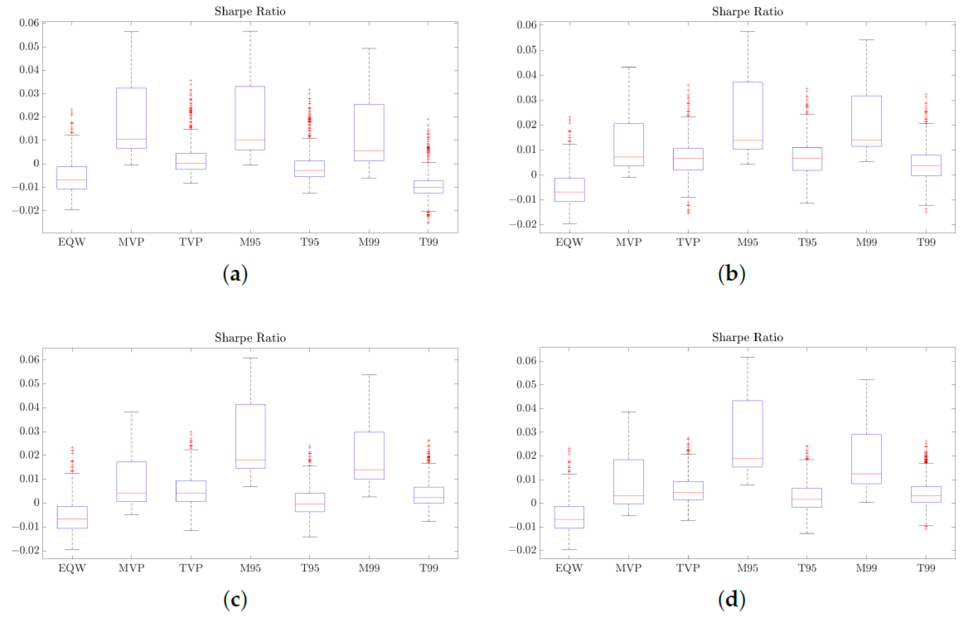 Figure 6 reports the Sharpe ratios of the optimized portfolios under the long-only and long–short specifications. In all configurations, the optimized portfolios tend to achieve higher Sharpe ratios than the EQW portfolio, confirming that systematic optimization improves the average reward per unit of total risk. Among the optimized strategies, the minimum-variance and minimum-CVaR portfolios (MVP, M95, M99) typically show the highest median Sharpe ratios. This is consistent with their construction: by explicitly minimizing variance or tail risk, these portfolios tilt towards the more stable ETFs in the universe and avoid the weakest performers, so that volatility in the denominator of the Sharpe ratio is reduced without sacrificing all of the available return premia.