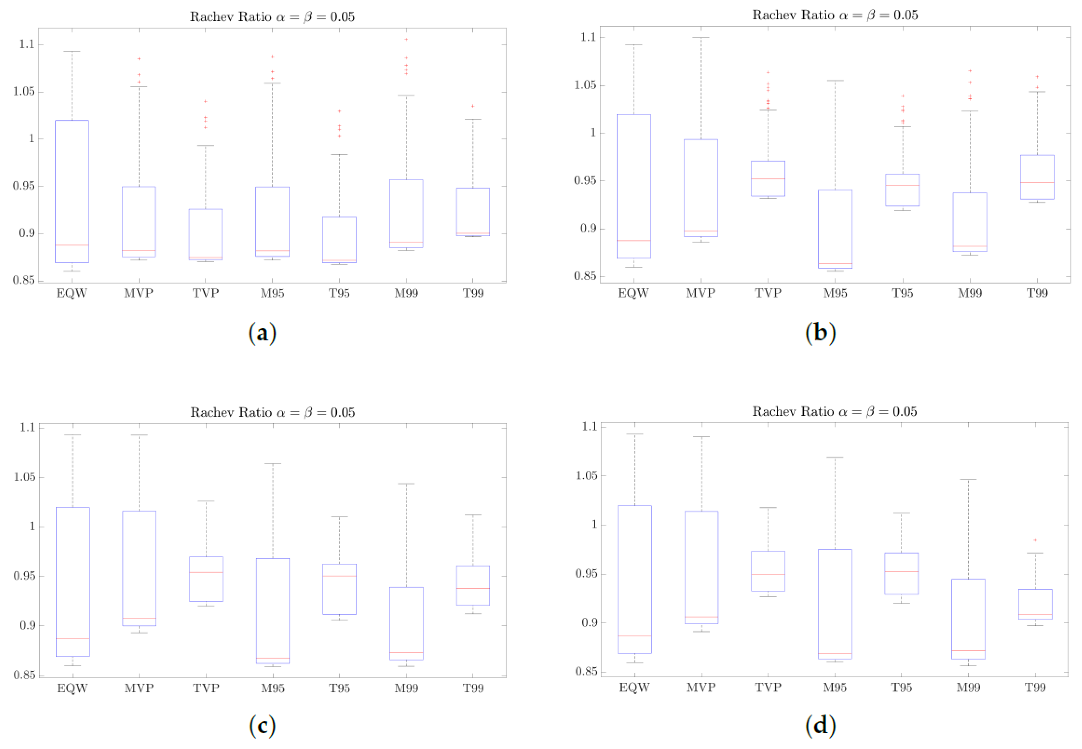 Figure 8 show that Rachev ratio values for all portfolios remain within a relatively narrow band around unity. This suggests that none of the portfolios exhibits a persistent extreme imbalance between upside and downside tail outcomes. Comparing long-only and long–short configurations, the overall pattern of Rachev ratios is broadly similar across leverage levels. In several cases, particularly for EQW and the more return-oriented portfolios, the long–short variants display wider interquartile ranges, consistent with leverage amplifying both favorable and unfavorable tail realizations. Taken together, the Rachev results suggest that portfolios differ primarily in the dispersion of tail outcomes rather than in a systematic shift toward more favorable tail asymmetry.