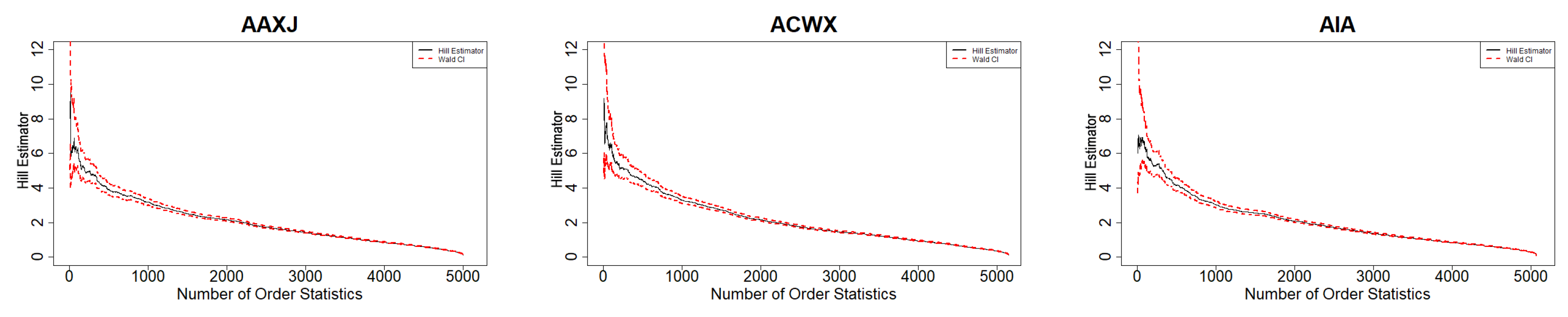 Visual inspection of the DJIA and EQW plots shows that both series exhibit heavy but finite tails, but the nature of that tail risk differs. The Hill curve for the DJIA stabilizes around a higher value of the tail index, suggesting that extreme events decay more rapidly and the likelihood of very large losses is relatively low. In contrast, the EQW portfolio, constructed by allocating equal weights to all 29 Asian and Asia-focused ETFs in our sample, settles at a lower tail-index level and displays wider confidence bands. This indicates that the EQW is more prone to extreme returns and carries greater tail risk than the reference U.S. large-cap index, consistent with the higher volatility and lower liquidity typically associated with emerging and regionally concentrated exposures.