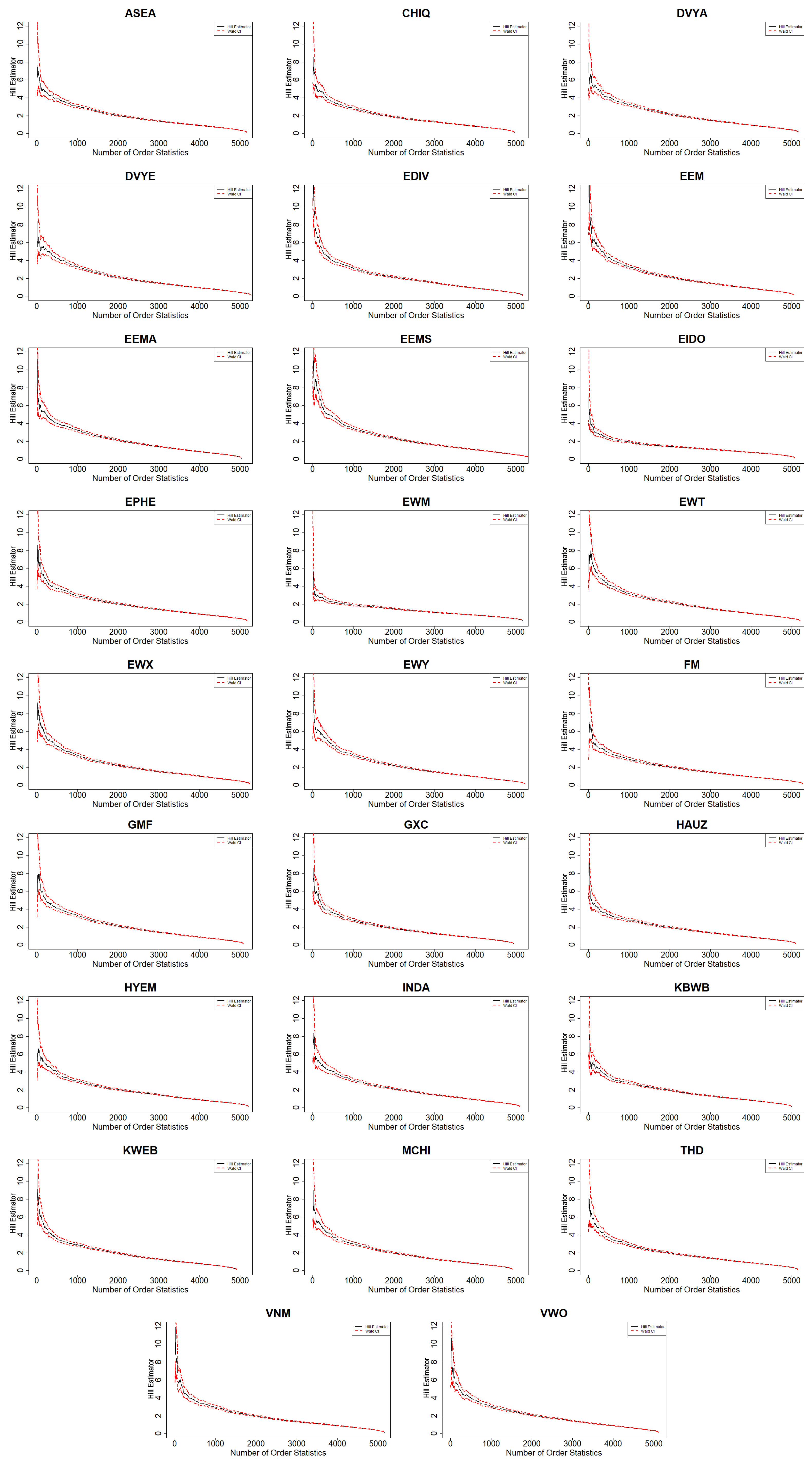 Across the individual ETFs, the Hill curves share a broadly similar shape, but their stabilized levels differ, revealing nontrivial heterogeneity in tail behavior across funds. ETFs with more concentrated, small-cap, or high-yield exposures tend to display somewhat heavier tails, while larger, more diversified regional funds exhibit relatively thinner tails. These differences suggest that extreme risk within the Asian ETF universe is not uniform but depends on the underlying market segment and investment focus.