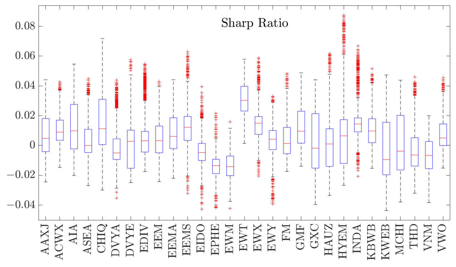 Appendix C presents boxplots of the Sharpe, STARR, and Rachev ratios for the 29 individual Asian ETFs. This highlights how each ETF performs on a risk-adjusted basis and complements the portfolio-level results reported here.