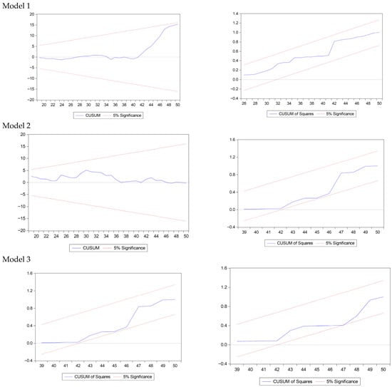 For all the variables, the models were stable as they fall within the confidence bands of 5% significance as shown in Figure 2. Thus, all the parameters of the models are stable within the estimated period. There are no structural breaks that could be detected from the estimated co-efficient; therefore, the ARDL models are stable.
