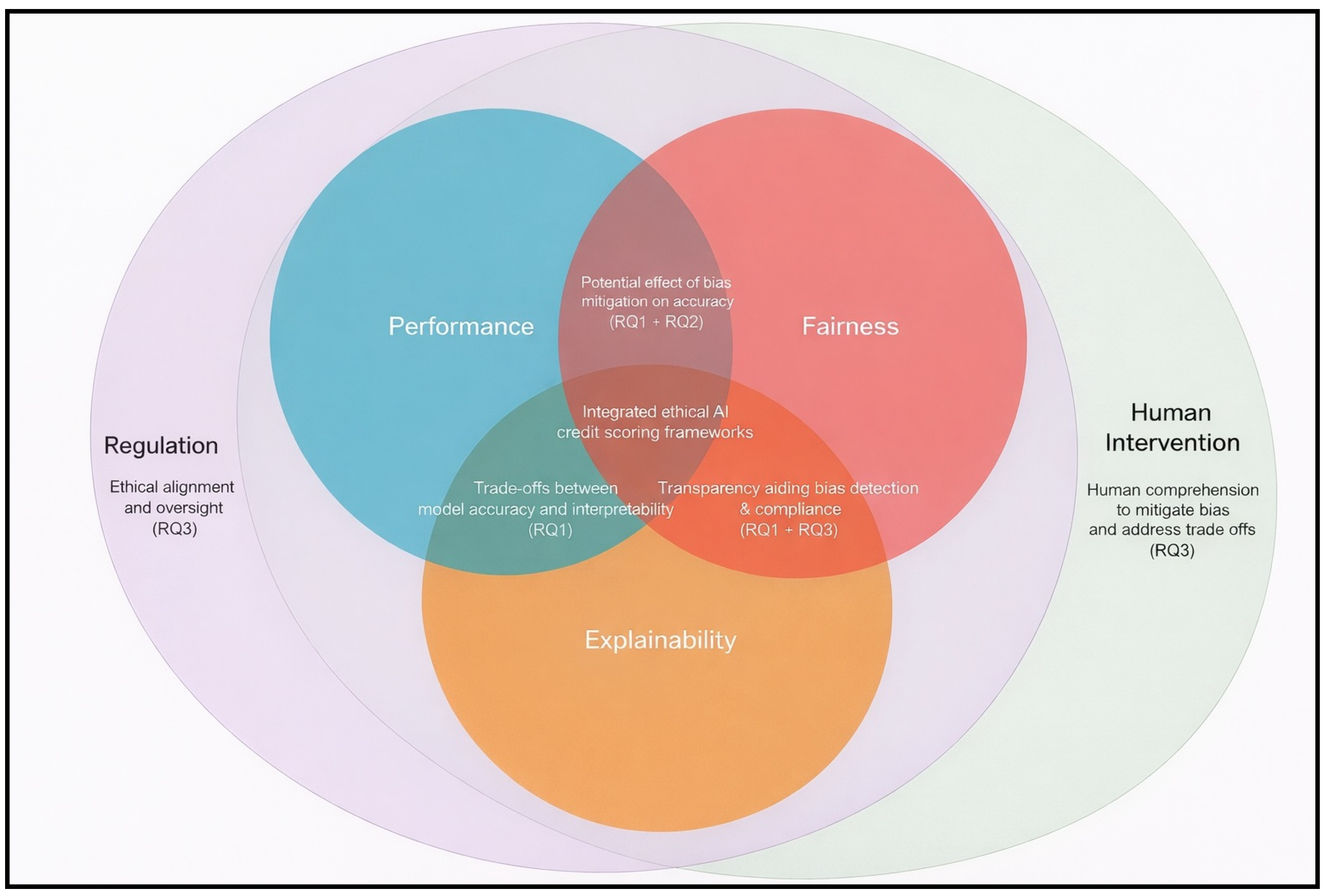 - RQ3: How do regulatory frameworks and human-in-the-loop (HITL) approaches influence the interpretation of fairness across different contexts, and how can they be incorporated into ethically aligned AI models? Given that AI models are prone to biased decisions and lack transparency in how their results are determined, the intervention of regulatory bodies underscores the importance of consciously adopting AI in domains involving monetary decisions and fundamental human rights. While precision and accuracy were the ultimate goals sought in the past, the loss of transparency has proven far more costly in critical and regulated domains, making explainability a necessity rather than an option (Chen et al., 2024). Ensuring this balance enables the responsible and accountable deployment of AI in credit scoring domains, supported by adequate human oversight to maintain compliance with local regulations, and ensures that results remain comprehensible to human decision-makers (Peng et al., 2023).