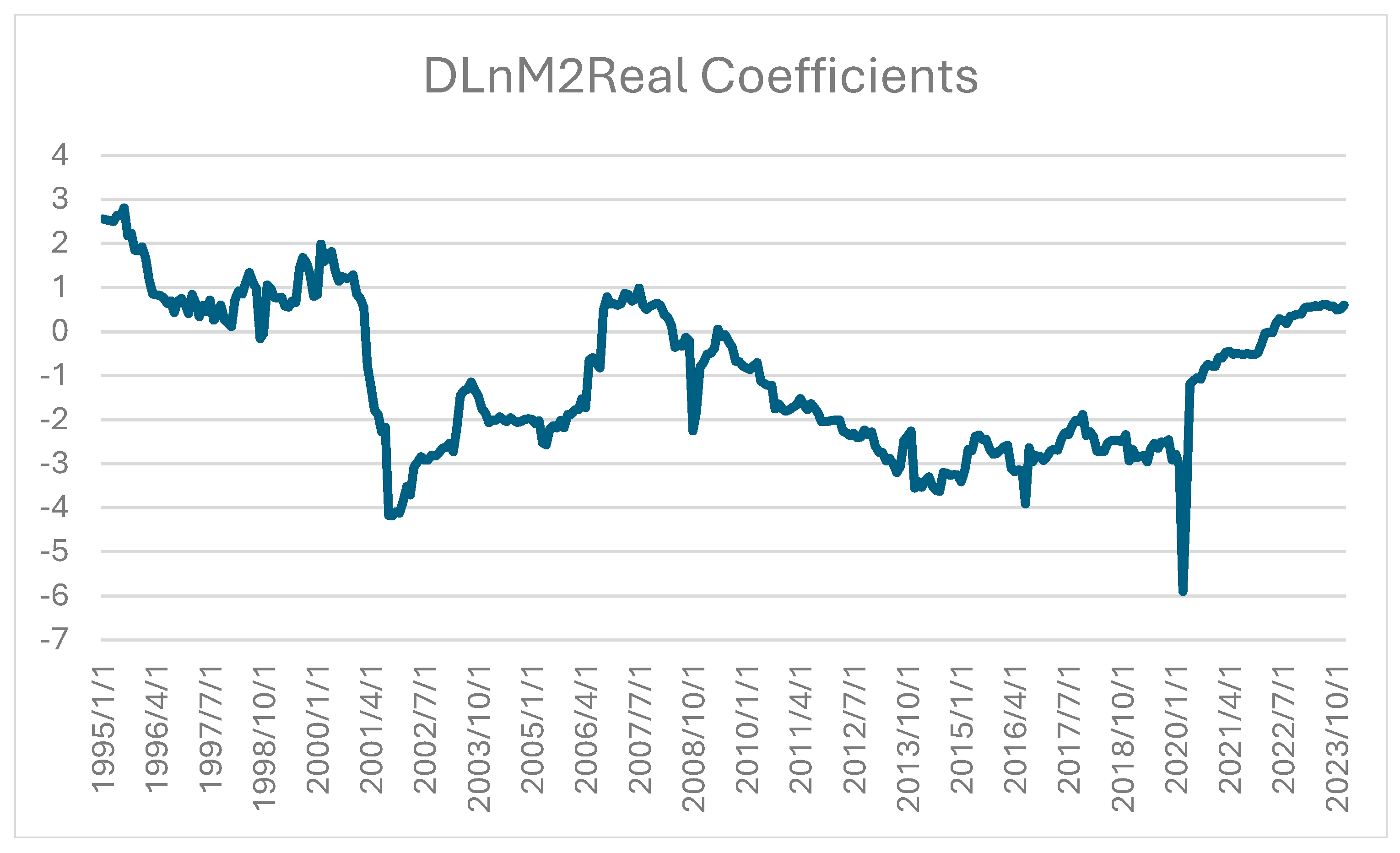 Figure 2. Notice that the coefficients of DLnM2Real have three major responses around the early 2000s period after the internet crash, then around the Global Financial Crisis of 2007–2008 and during the early pandemic period of 2020. Two monetary variables play a complementary role. The coefficients of M2Real fluctuate before 1999 and remain stable and positive after 2001. Fed Funds coefficients contribute stable stimulus to the stock market, but their dramatic drop could not stabilize markets during the Great Financial Crisis. On the other hand, the cyclical variables of industrial production and home prices have cyclical coefficients, primarily before the Global Financial Crisis. The coefficients of expected inflation and the T10Y2Y have no discernable patterns.