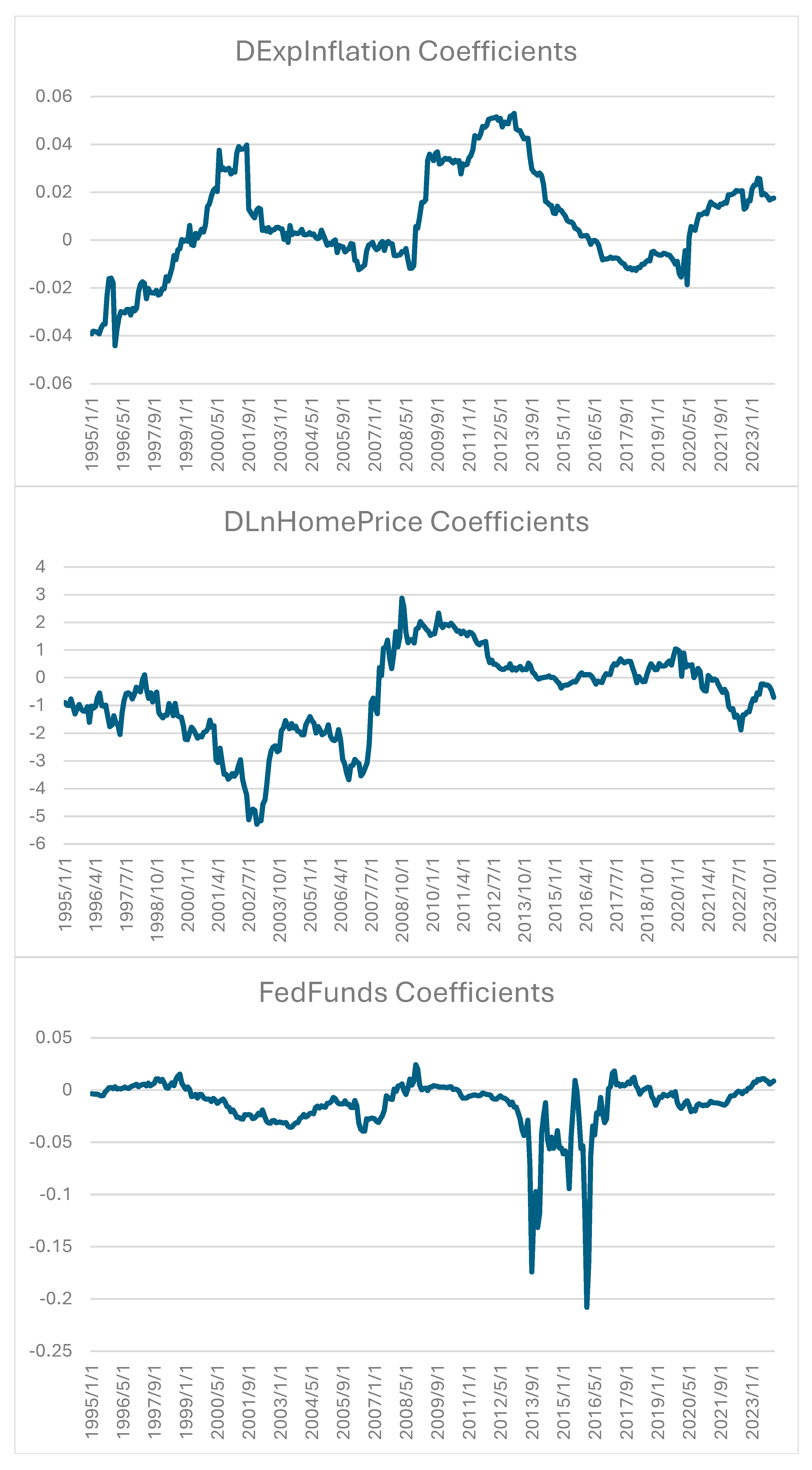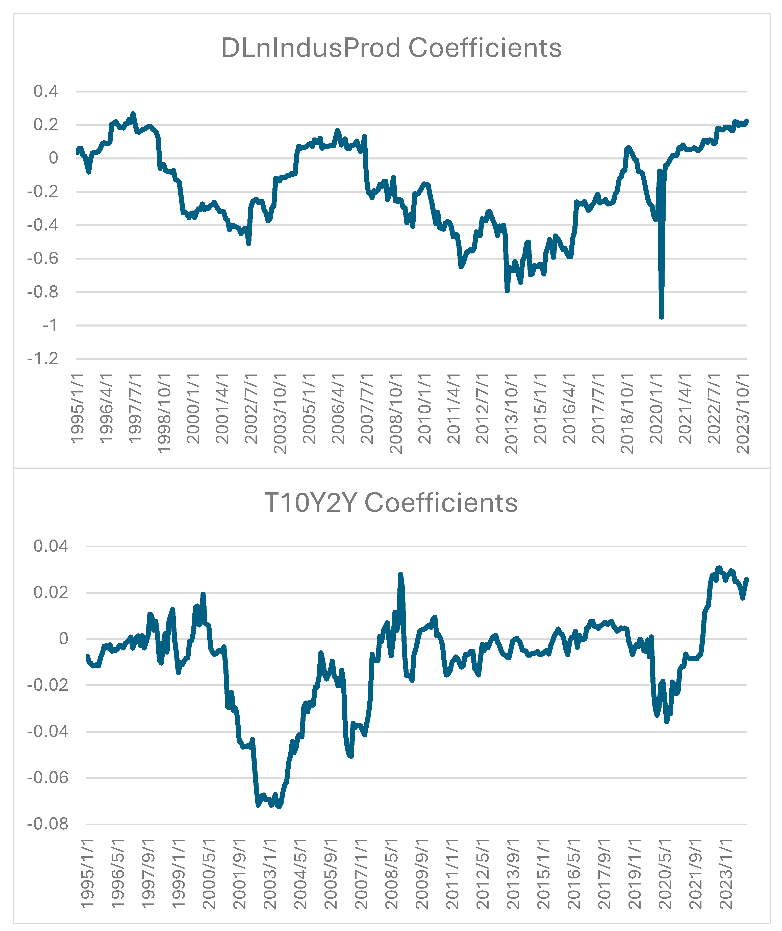 Table 5, we see that DLnM2Real and DLnHomePrice have coefficients that range from largely (relatively) negative to largely positive. T10Y2Y and Fed Funds are typically negative but occasionally flip sign, suggesting regime dependence. Industrial production growth is modest and centered slightly negative. Expected inflation has a small mean effect with limited dispersion relative to other inputs.