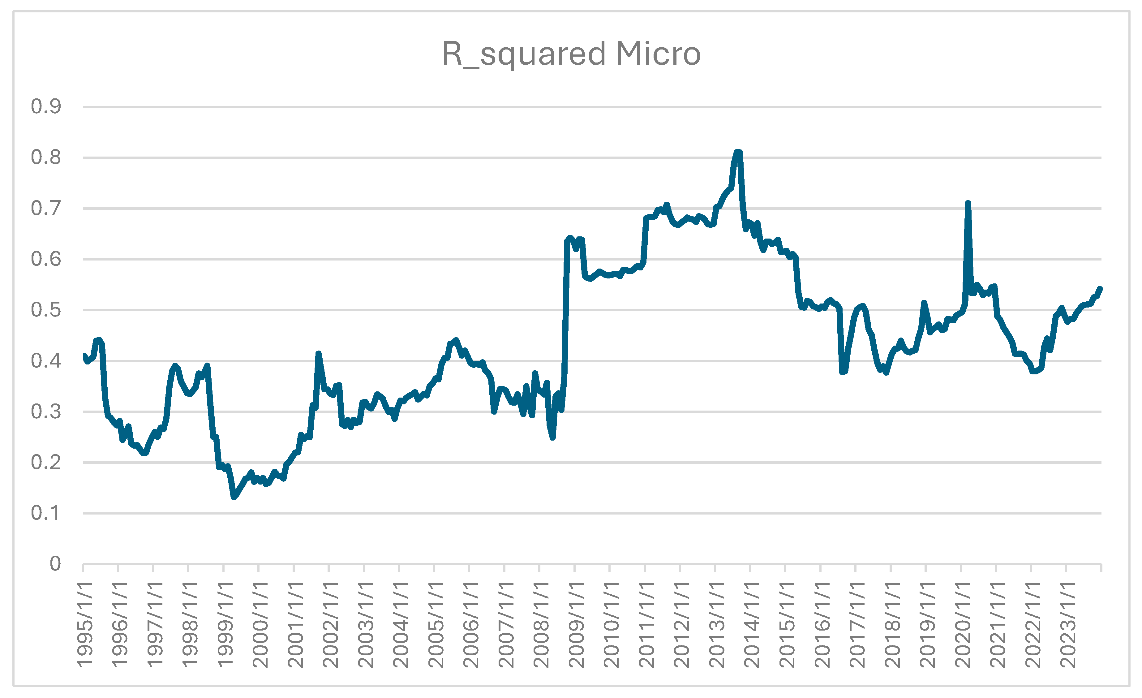 Figure 1 illustrates the statistical performance of the macro narrative from the point of view of R-squared. Numerically, R-squared fluctuates around 0.2 from 1995 to the Global Financial Crisis of 2007–2008. During this interval, the market experienced an exuberance, followed by the internet crash and a short recession. In particular, between 1999 and 2003, the S&P 500 Index suffered a significant downturn, known as the internet dot-com bubble burst. The S&P 500 Index declined from a high of 1527.46 in March 2000 to a low of 768.83 in October 2002. This is a 50% decline. In particular, the NASDAQ underwent a dramatic 80% loss from its peak during the same period.