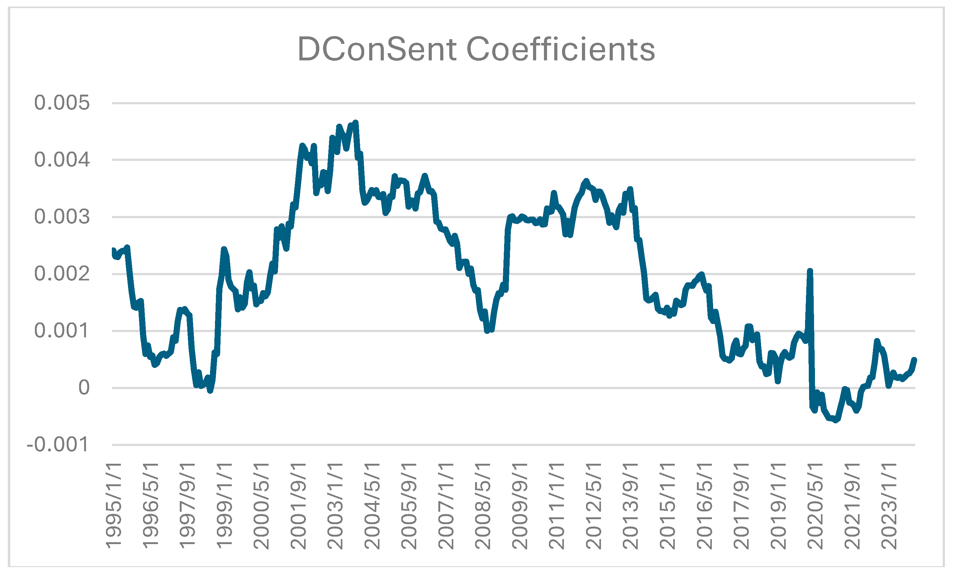 Table 8, we see that DLnDollarInd coefficients show a consistently negative effect on equity returns but with substantial time variation, occasionally flipping signs. LnVIX coefficients are robustly negative on average, consistent with volatility acting as an uncertainty indicator. DLnCopper coefficients are positive, suggesting cyclical growth sensitivity. DLnEarn coefficients display the largest dispersion, indicating strong regime dependence on how earnings growth maps to equity returns. DConSent coefficients are small in magnitude but very stable in sign.