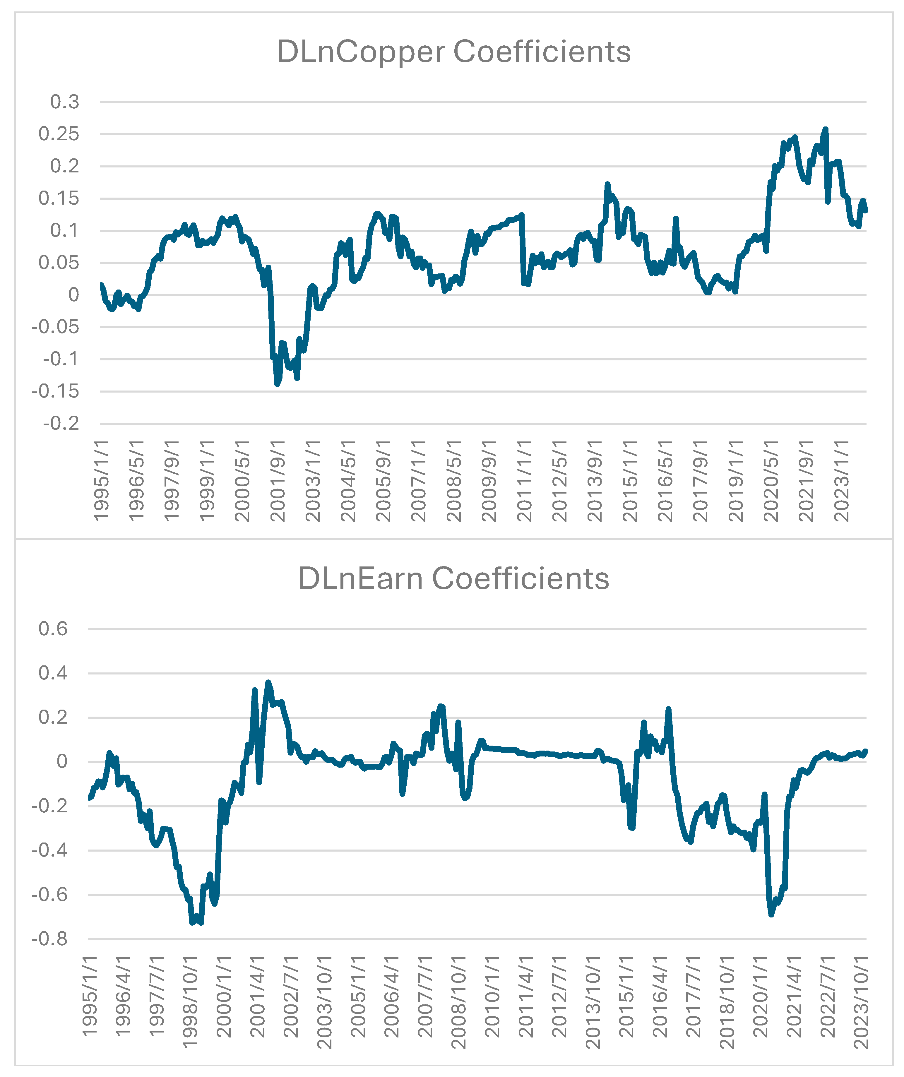 Figure 4 is a set of six diagrams illustrating the behavior of the six micro narrative individual coefficients. Observe that the first three exhibit a cyclical and similar behavior to the stock market. The fourth and fifth diagrams are also cyclical with more frequency and less amplitude. DLnCopper has a lengthy period of stable coefficients except during the internet crash and the COVID-19 periods. DLnEarning has a similar behavior to DLnCopper with a bigger drop in the values of coefficients during the internet crash and the COVID-19 period.