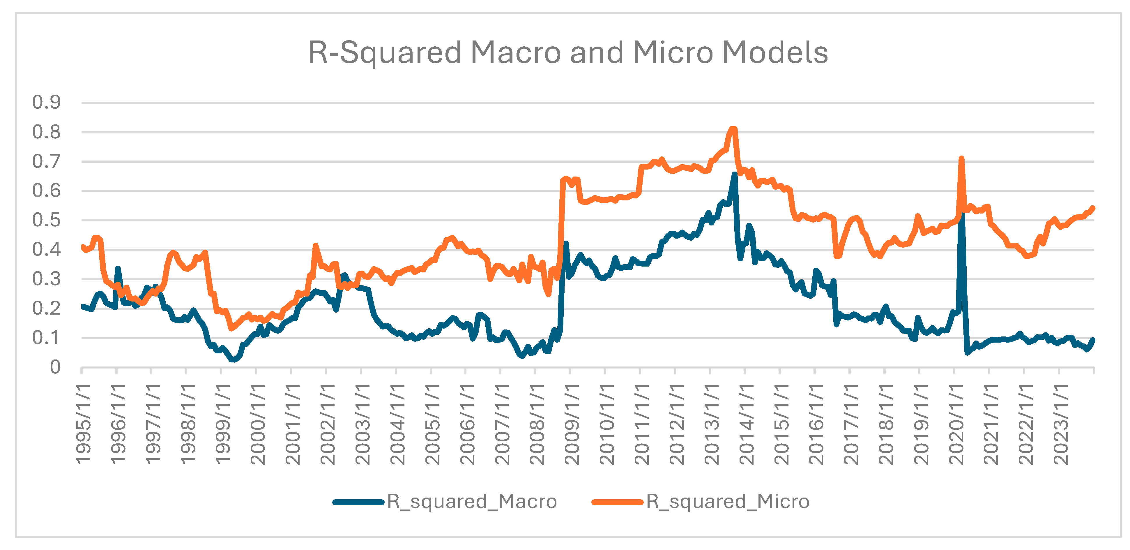 Figure 5, a comparison of the R-squared values corresponding to the two narratives proposed and evaluated in this paper. Clearly the microeconomic narrative is supported best by the statisitcal data. The macro regressions produce R-squared values that are significant at 41.7% compared to the micro regressions that has R-squared values that are significant at 92.8%. They both show jumps around the Global Financial Crisis and COVID-19. Also, for both narratives, the period from 1990 to the Global Financial crisis is more stable than the period between the Global Financial Crisis and COVID-19.