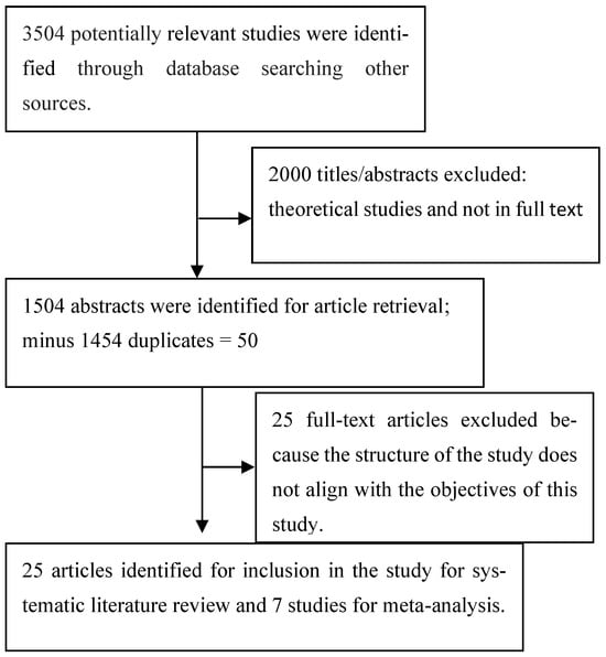 The application of the search strategy yielded 3504 potential studies; 2000 were excluded based on their titles and abstracts. The remaining 1504 papers were retrieved and reduced to 50 after removing duplicates, and 25 papers were ultimately left after thorough assessment of the papers using the outlined inclusion and exclusion criteria, specifically due to lack of empirical data and conceptual focus; most studies focused on financial inclusion, but this study focuses specifically on insurance inclusion and insurance technology studies. Although only 25 studies were ultimately included from an initial pool of 3504 identified publications, this rate of inclusion (<1%) aligns with expectations for systematic reviews that apply stringent quality and relevance filters under PRISMA-P guidelines (Moher et al., 2015). Each study was reviewed for methodological rigor, theoretical alignment, and empirical relevance to Insurtech and insurance inclusion. Excluded papers typically failed to meet design transparency or contextual applicability criteria. The focus on quality rather than quantity ensures robustness and reproducibility of insights. Figure 1 presents the PRISMA 2020 flow diagram illustrating the stages of identification, screening, eligibility, and inclusion. All exclusion counts and reasons are explicitly shown to enhance transparency using the model in (Page et al., 2021).