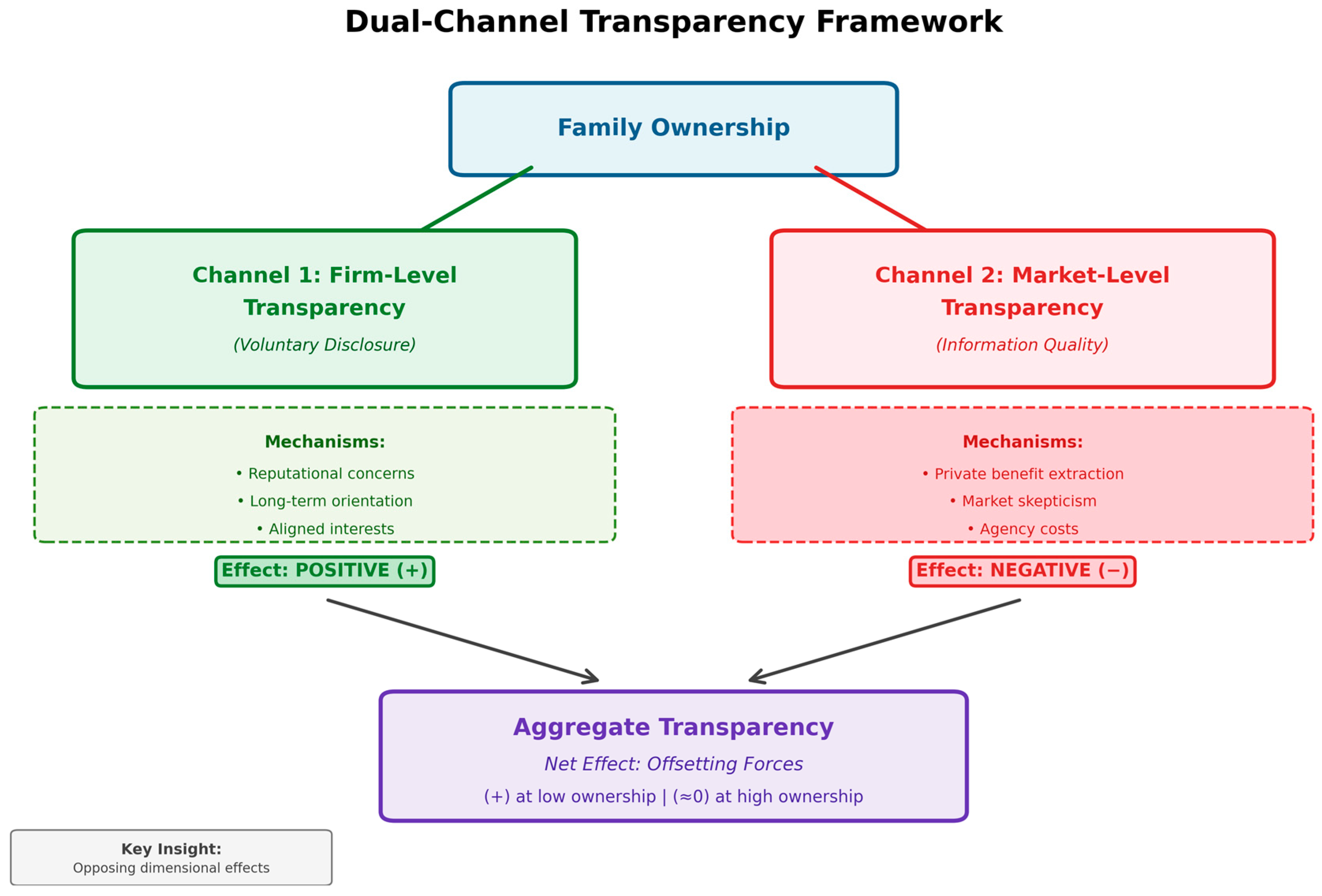 Figure 1 illustrates our dual-channel transparency framework, showing how family ownership influences corporate information environments through two distinct pathways with opposing effects.