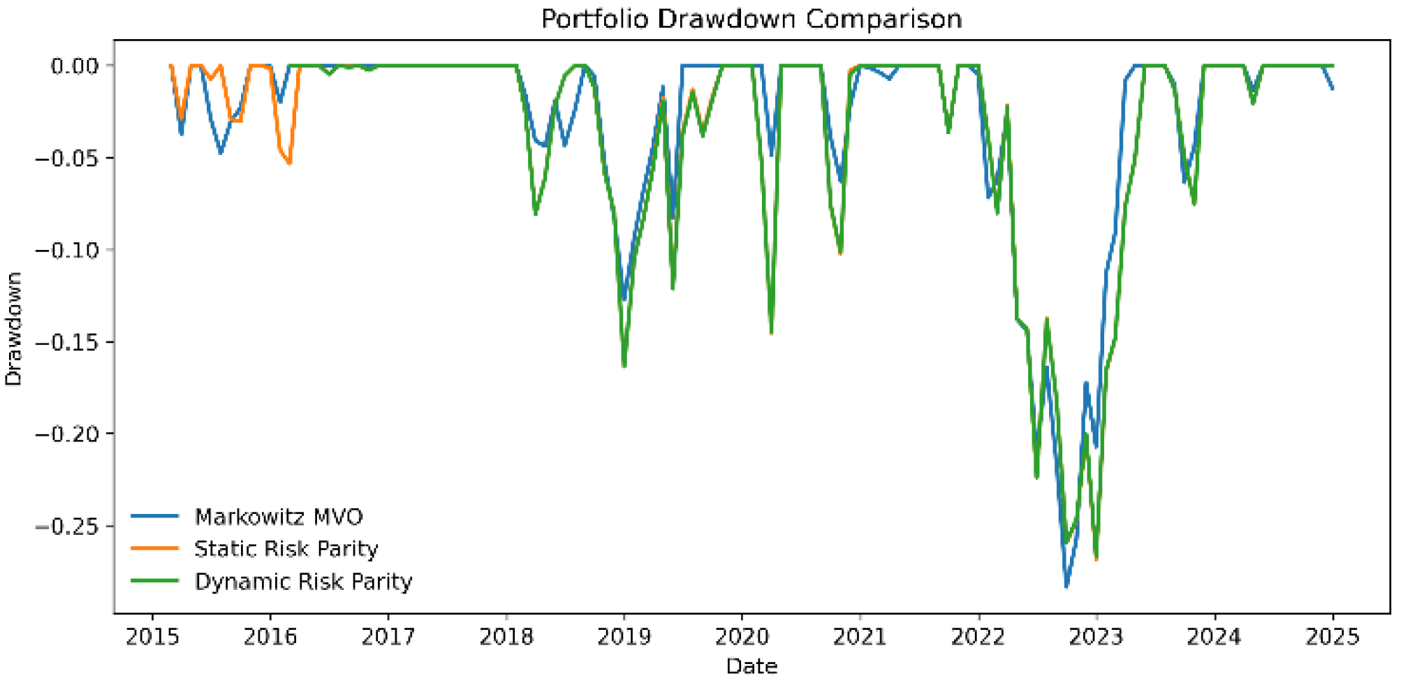 - Strategic Implication for Investors:The empirical findings underscore that Dynamic Risk Parity is particularly suitable for investors who prioritize stability, risk-adjusted performance, and dynamic risk management. By integrating risk parity principles with rolling-window adaptation, Dynamic RP offers a more robust out-of-sample alternative to Markowitz MVO, reducing the portfolio’s exposure to estimation error and enhancing resilience during periods of market stress. The strategy aligns with the practical objectives of institutional and individual investors seeking long-term wealth preservation while participating in market upside.