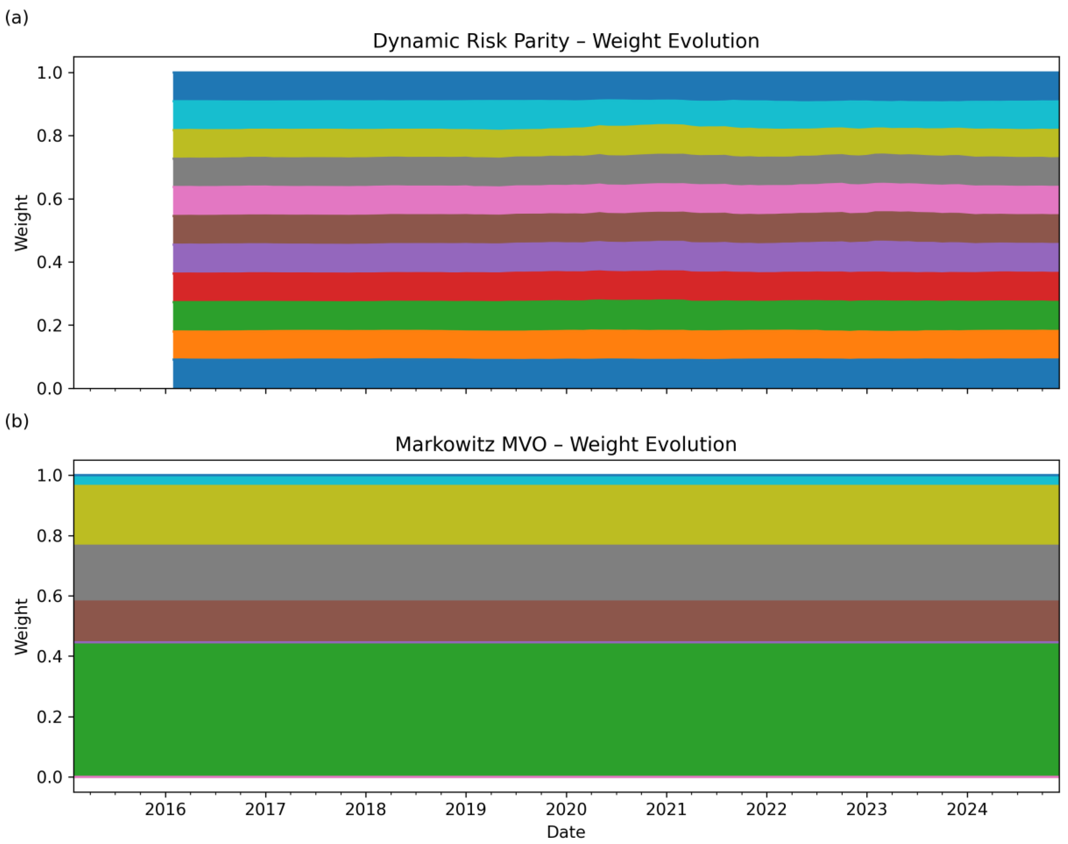 - Sharpe Ratio and Weight Stability:Dynamic RP delivers a higher Sharpe ratio than Static RP (1.418 vs. 1.368), confirming the hypothesis that dynamic adjustment enhances risk-adjusted performance. Although Markowitz MVO reports the numerically highest Sharpe ratio (1.655), this advantage is likely influenced by in-sample optimization bias and does not necessarily translate into robust out-of-sample performance. Moreover, Dynamic RP exhibits superior weight stability, maintaining relatively consistent portfolio allocations over time. This feature is particularly valuable in practical applications, as it reduces portfolio turnover, transaction costs, and implementation complexity, areas where MVO is notoriously unstable due to its high sensitivity to estimation errors in expected returns (μ) and covariance matrices (Σ).