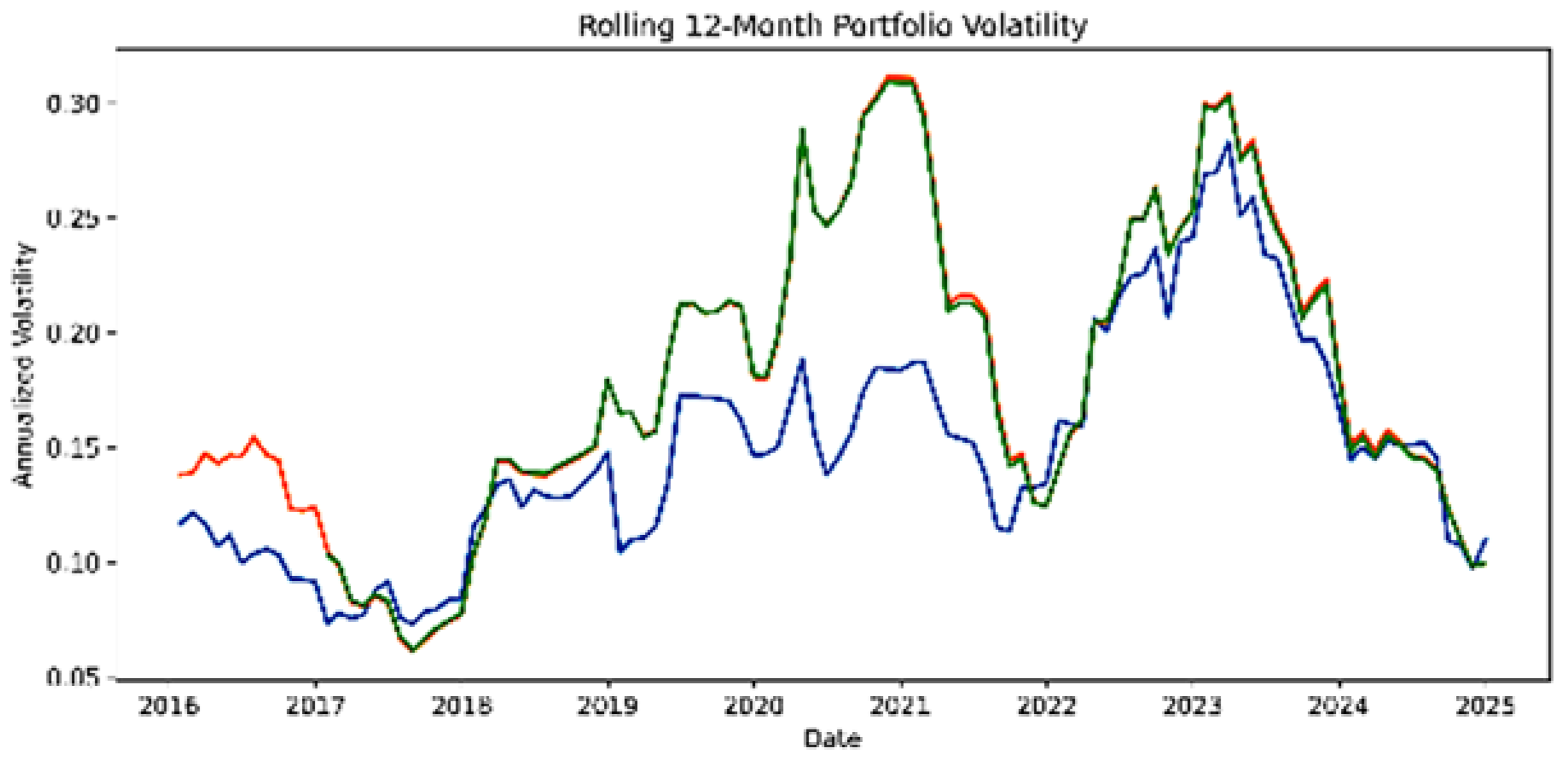 - Dynamic Adaptation to Market Conditions:Dynamic RP successfully enhances portfolio flexibility by adjusting asset weights on a monthly basis using a 12-month rolling window. This enables the strategy to respond to changing market volatility regimes, capture shifts in correlations, and adapt to evolving risk environments. Unlike MVO, which operates under a single-period static framework, or Static RP, which updates weights infrequently, Dynamic RP combines robust risk distribution with adaptive rebalancing, resulting in portfolios that are resilient under varying market conditions.