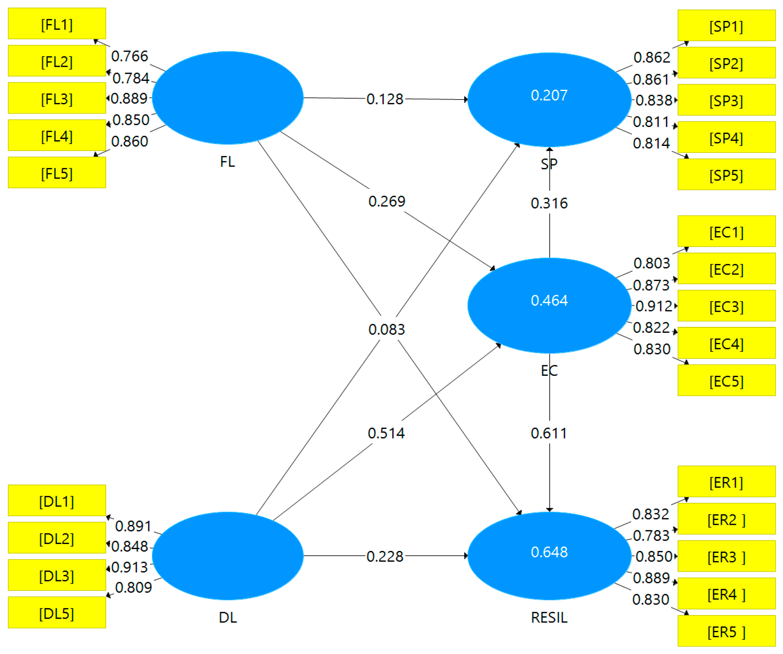 | DL→EC→RESIL | 0.228 [0.062–0.396] | 0.314 [0.199–0.444] | 0.542 [0.392–0.676] | 58% | 0.083 | 0.004 2 | 0.000 3 | Partial Mediation H7 Accepted |