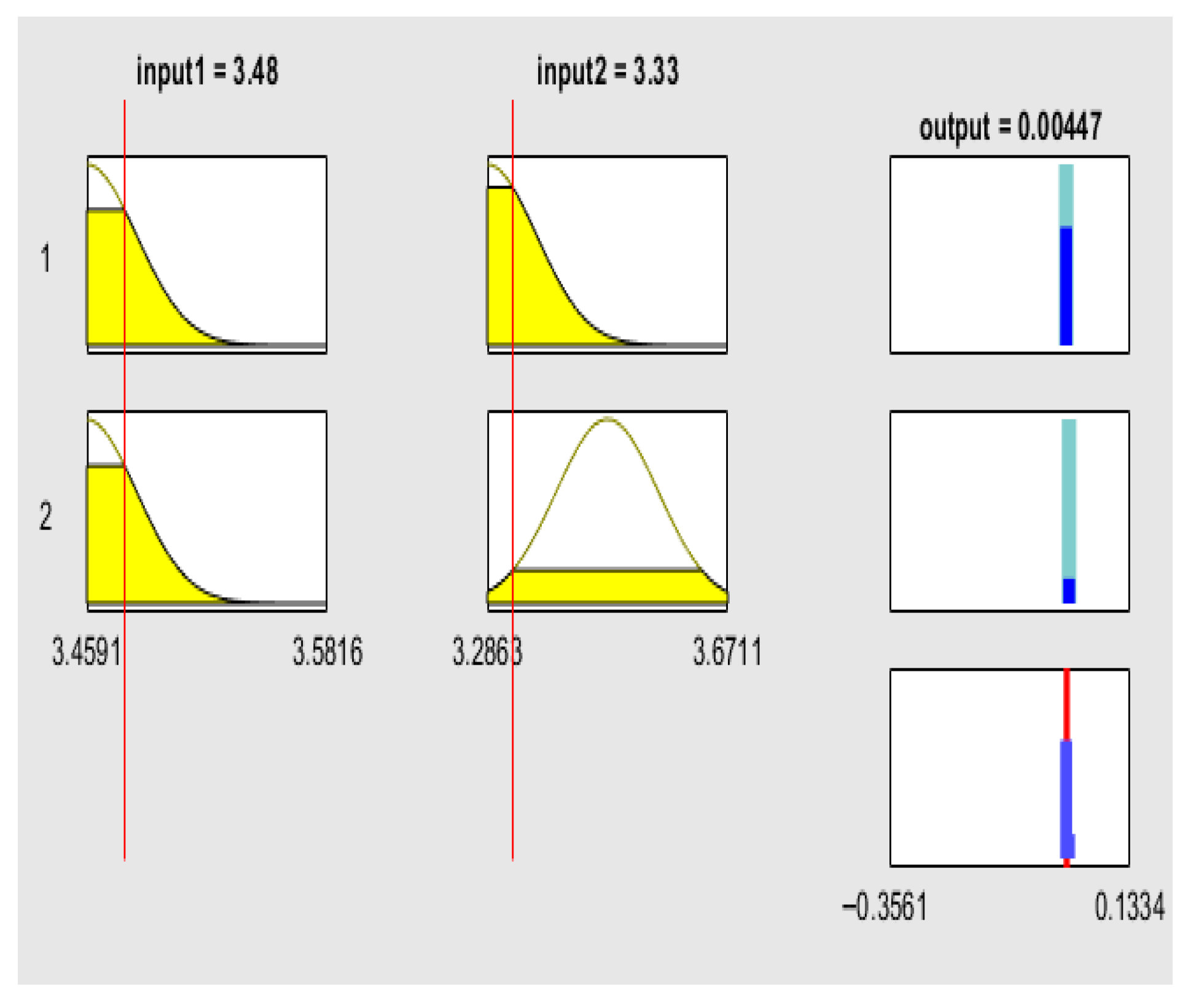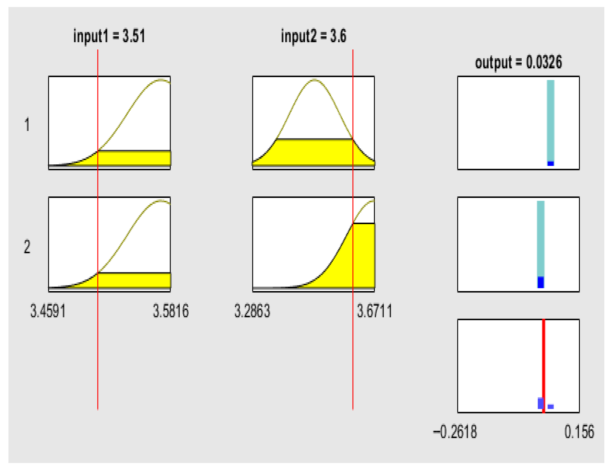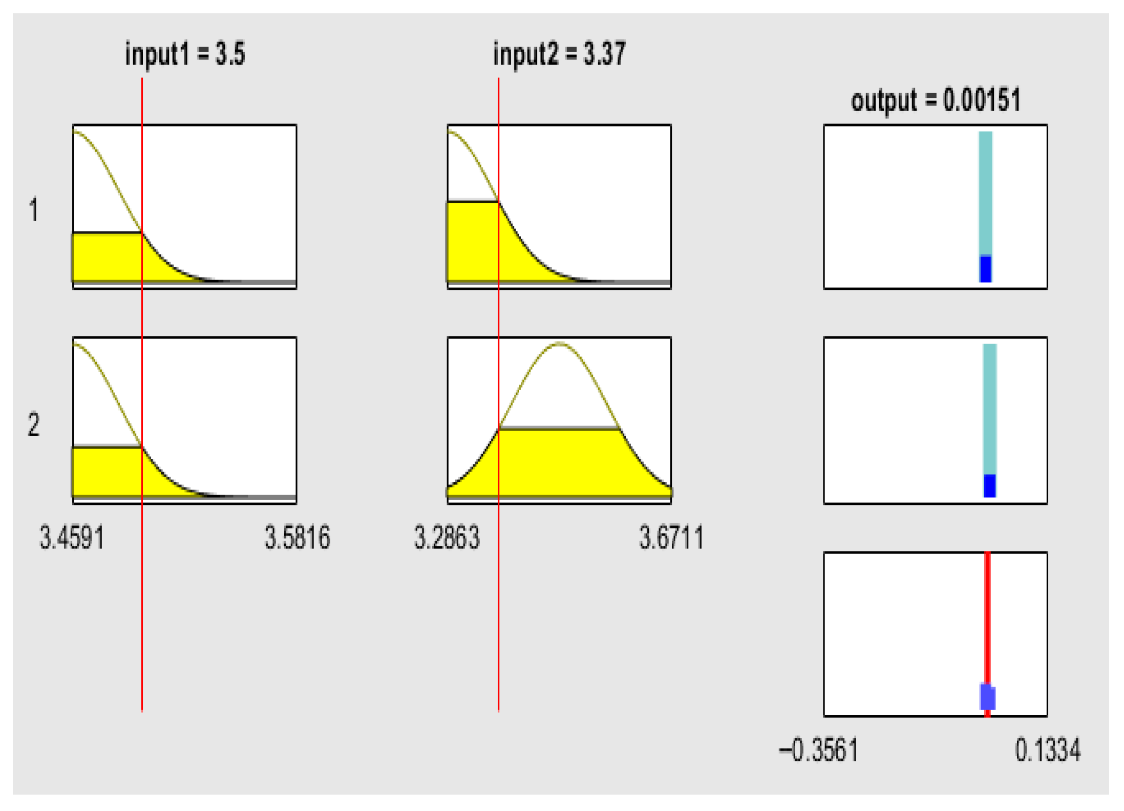 The rule viewer graphs of the fuzzy logic model provide a detailed, rule-based interpretation of how SRU influences the volatility of green financial assets. They display the interaction between the two input variables—the SRU Index—Global Equal Weighted (ESGUI_EQ) and the SRU Index—Global GDP Weighted (ESGUI_GDP)—and the predicted volatility of decentralized finance (DeFi) protocols and ESG-focused exchange-traded funds (ETFs). Each rule viewer consists of the input variables on the left and the output variable on the right. The yellow-shaded regions represent the range of possible uncertainty levels, while the red vertical lines mark the observed values of ESGUI_EQ and ESGUI_GDP. These red lines move across the uncertainty spectrum to indicate the degree of global (ESGUI_EQ) and macroeconomic (ESGUI_GDP) ambiguity affecting market conditions. On the output side, the cyan bars reflect the range of possible volatility levels, and the red line indicates the predicted volatility corresponding to the current input conditions.