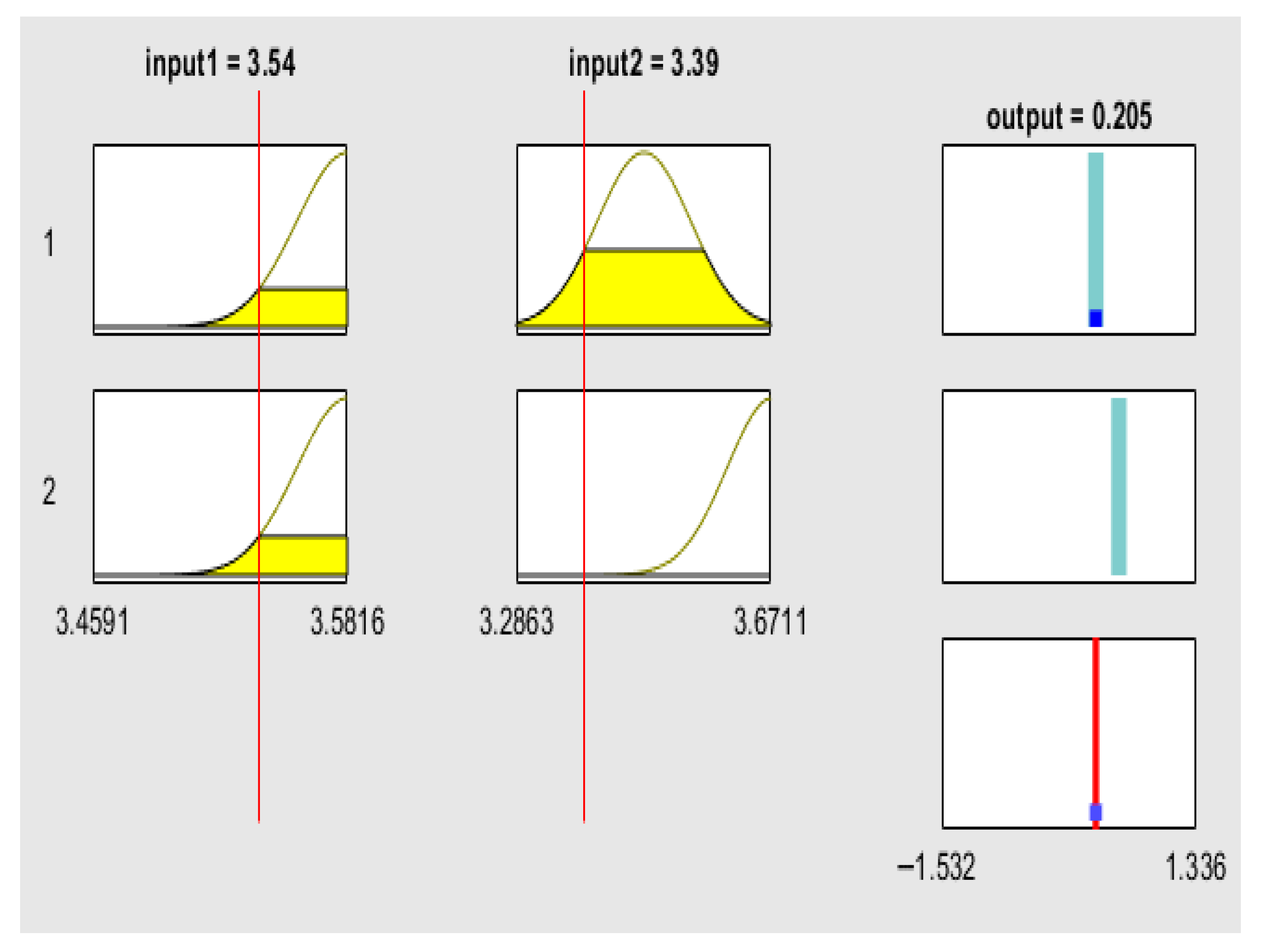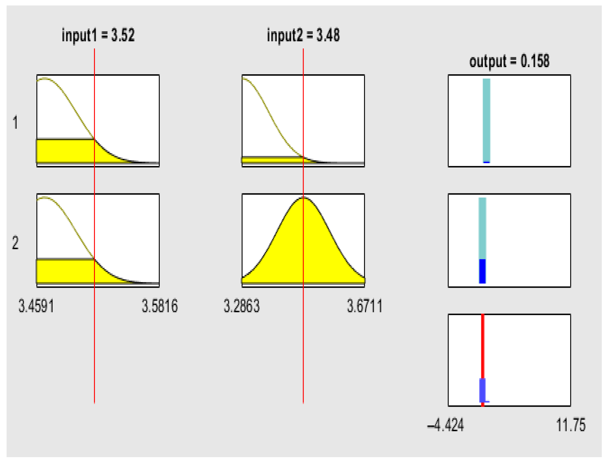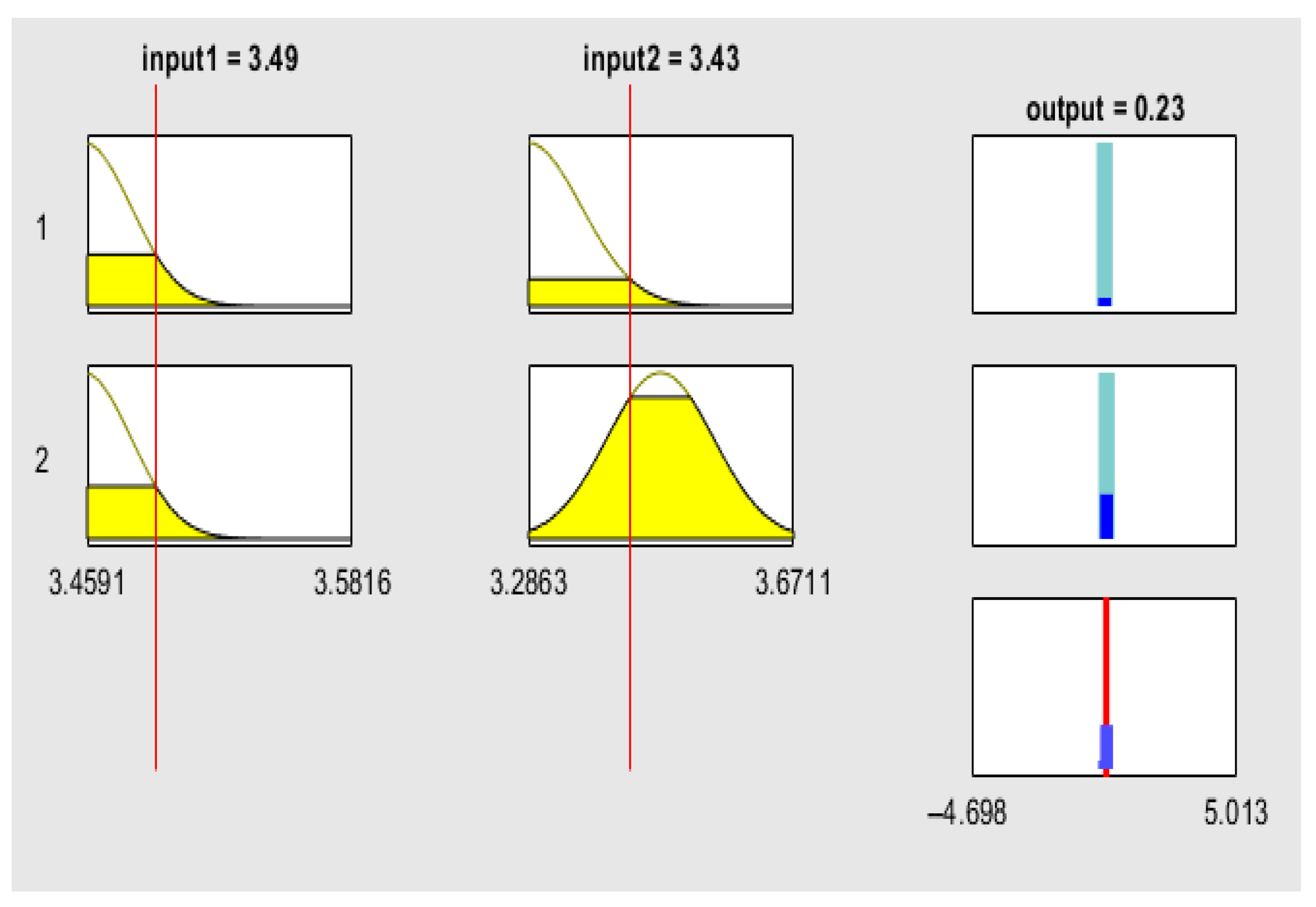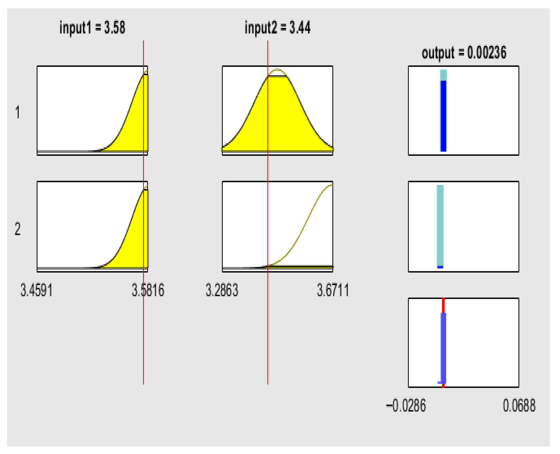The rule viewer graphs of the fuzzy logic model provide a detailed, rule-based interpretation of how SRU influences the volatility of green financial assets. They display the interaction between the two input variables—the SRU Index—Global Equal Weighted (ESGUI_EQ) and the SRU Index—Global GDP Weighted (ESGUI_GDP)—and the predicted volatility of decentralized finance (DeFi) protocols and ESG-focused exchange-traded funds (ETFs). Each rule viewer consists of the input variables on the left and the output variable on the right. The yellow-shaded regions represent the range of possible uncertainty levels, while the red vertical lines mark the observed values of ESGUI_EQ and ESGUI_GDP. These red lines move across the uncertainty spectrum to indicate the degree of global (ESGUI_EQ) and macroeconomic (ESGUI_GDP) ambiguity affecting market conditions. On the output side, the cyan bars reflect the range of possible volatility levels, and the red line indicates the predicted volatility corresponding to the current input conditions.
