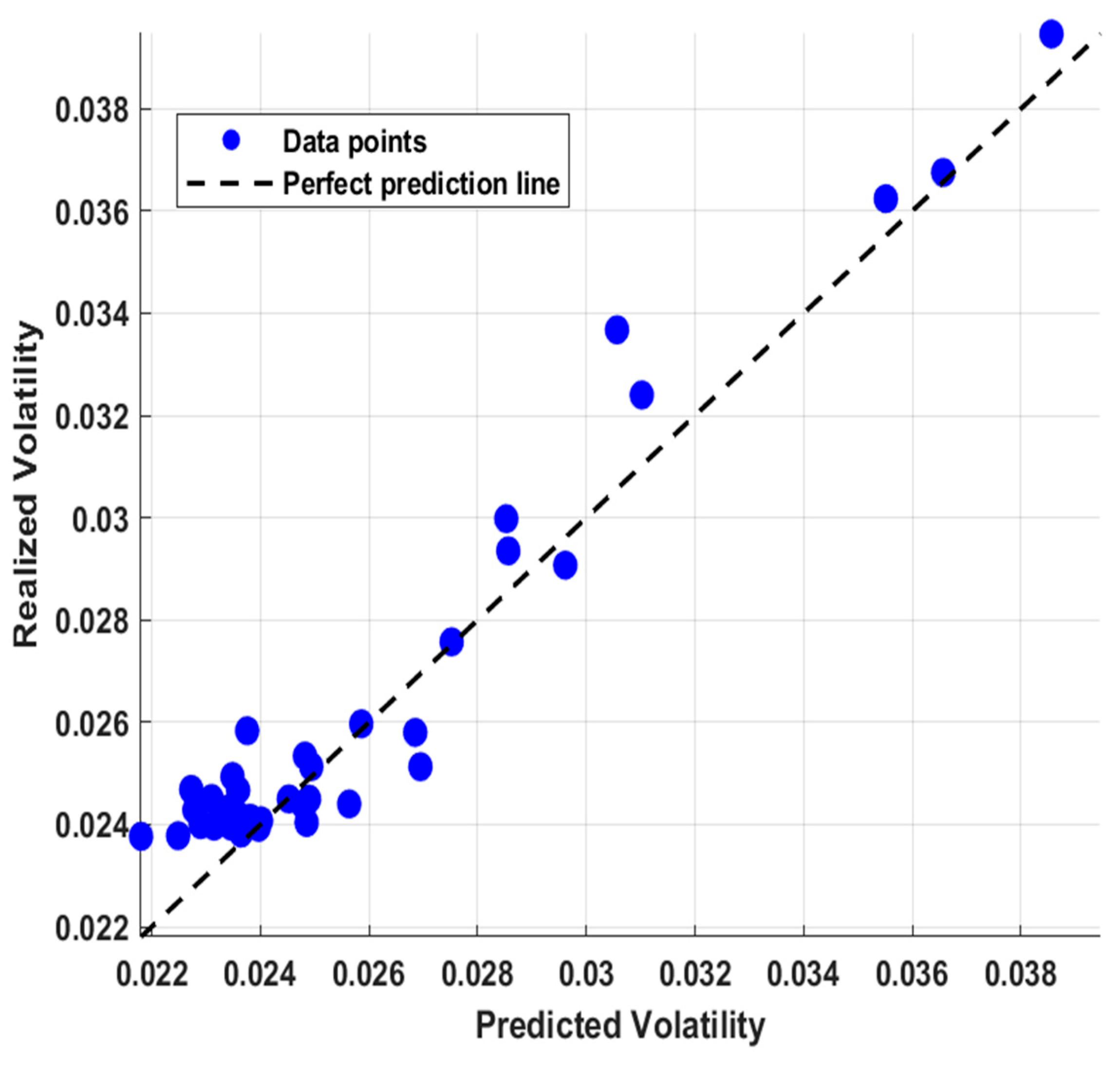 To assess the predictive capacity of the fuzzy logic model for green asset volatility, we calculated the Root Mean Square Error (RMSE) and conducted scatter plot analyses comparing predicted and realized volatility. This approach visually and statistically demonstrates the model’s effectiveness in capturing significant fluctuations, highlighting structural differences between decentralized DeFi protocols and regulated ESG-focused ETFs in response to SRU.