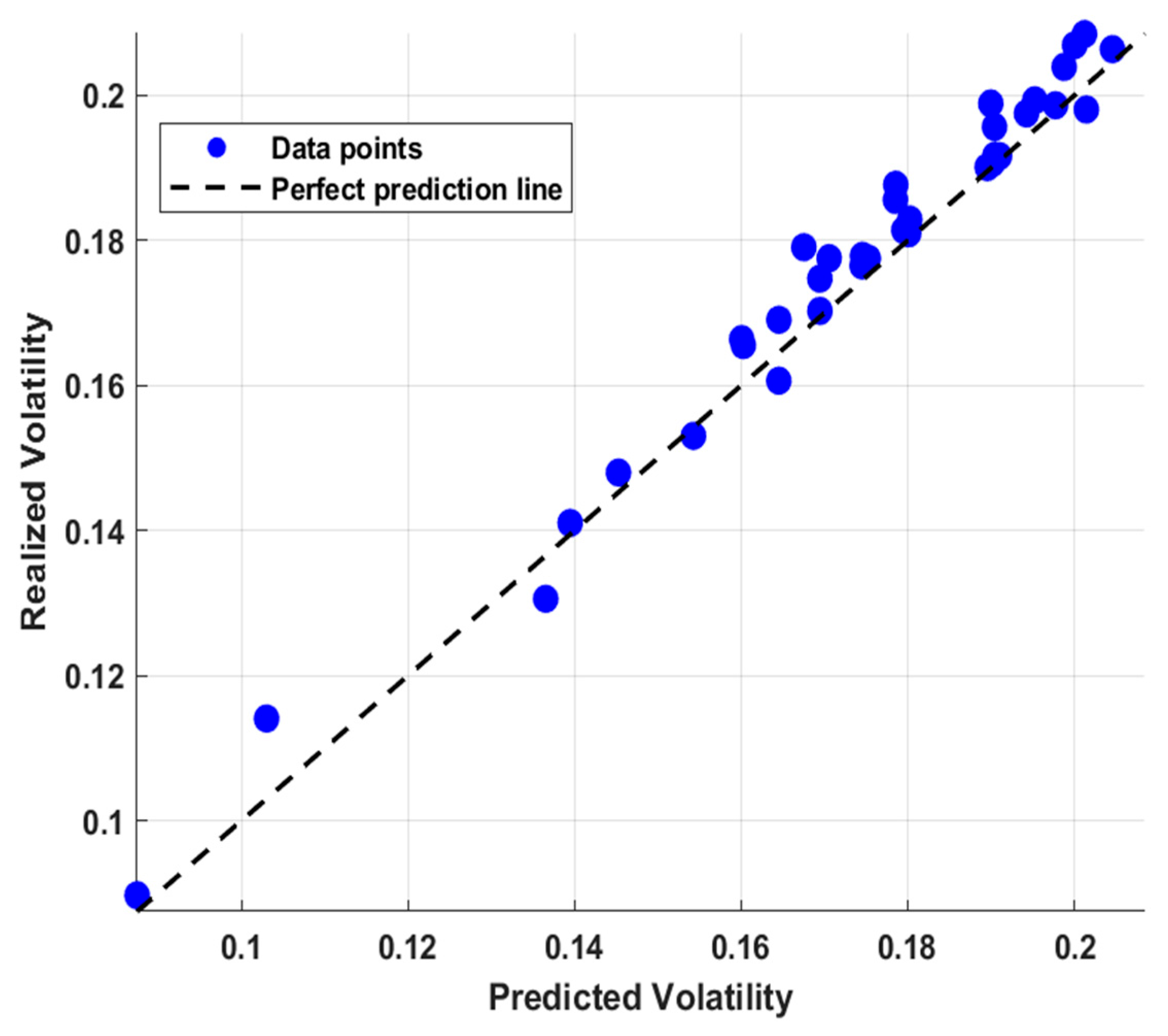 Figure 3 presents the scatter plot illustrating the relationship between predicted and realized volatility for KlimaDAO (KLIMA) and is retained in the main text as a representative example. The x-axis reports volatility predicted by the fuzzy logic model based on the SRU Index in its equal-weighted (ESGUI_EQ) and GDP-weighted (ESGUI_GDP) forms, while the y-axis shows realized volatility measured as the conditional standard deviation from a GARCH(1,1) model estimated on monthly log returns. The 45-degree reference line (y = x) represents perfect prediction; observations clustering around this line indicate high predictive accuracy.