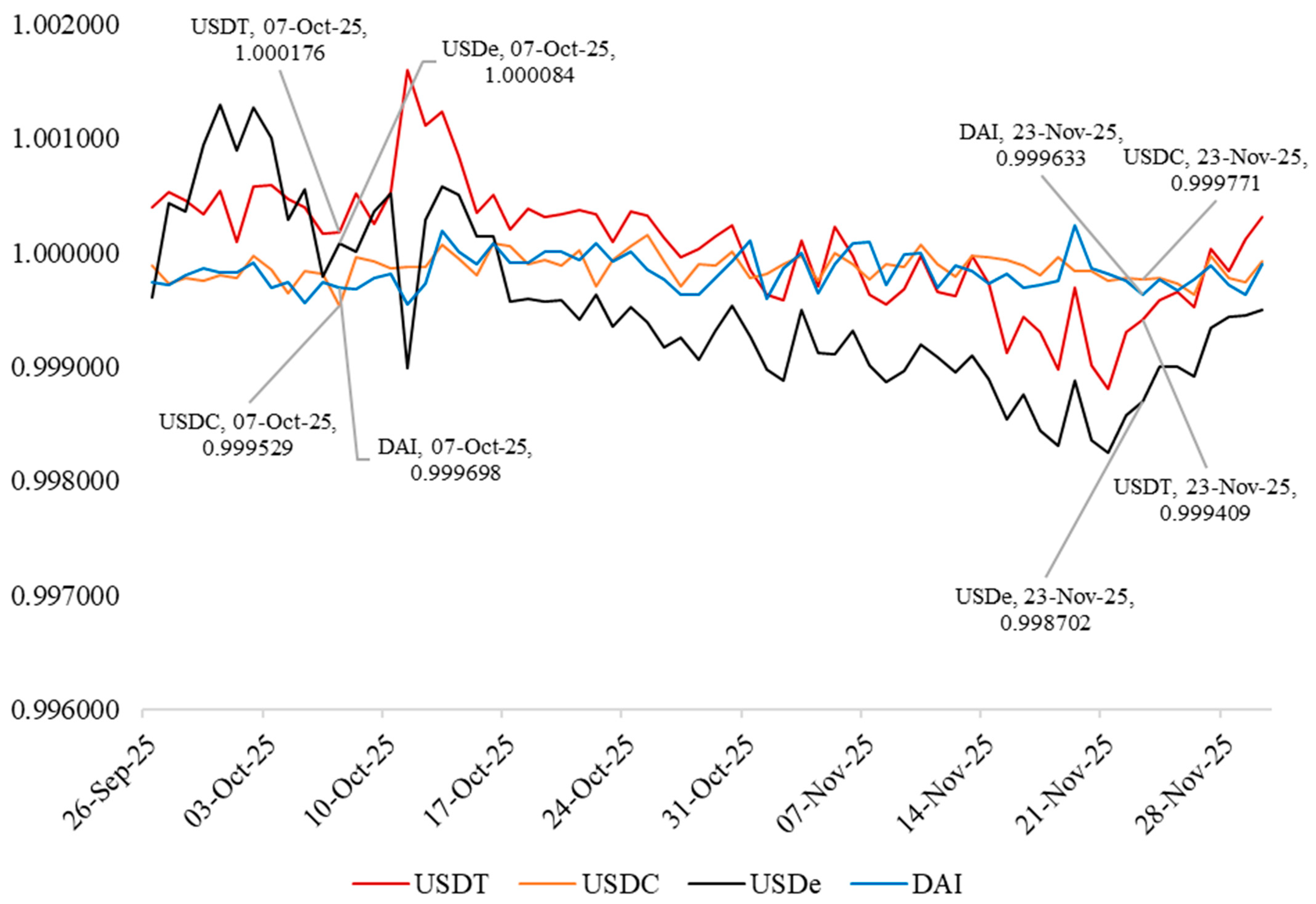 - Duan, K., & Urquhart, A. (2023). The instability of stablecoins. Finance Research Letters, 52, 103573. [Google Scholar] [CrossRef]