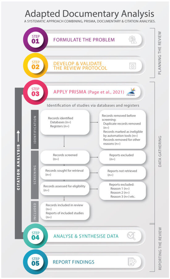 Therefore, this article followed an adapted, yet complementary, newly synthesised documentary analysis, incorporated with PRISMA, which respectively represent a different point of departure from the stand-alone methods already covered in this section. The adaptations provided a platform for presenting a step-by-step rationale for conducting robust, integrative documentary analysis, which, to the authors’ best knowledge, has not been done in the capital structure literature. The attention to systematisation was intended to mitigate bias and build credibility and transparency into the data extraction process, improving the trustworthiness of the results. The adaptation of documentary analysis, the PRISMA protocol, and citation analysis, as applied, is displayed in Figure 1.
