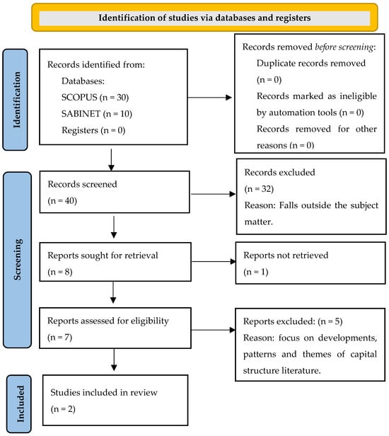 Consequently, the same search terms were used for the SABINET database. The advanced search function was used. Because the search functionality differed from SCOPUS, the search was conducted differently. Three searches were necessary—the first, “capital structure” and “systematic review,” returned two documents. The second, “capital structure” and “bibliometric”, returned one document; the third, “capital structure” and “meta”, returned seven documents. Therefore, 10 documents were identified in the SABINET database. In total, 40 documents were identified. There were no duplicates.