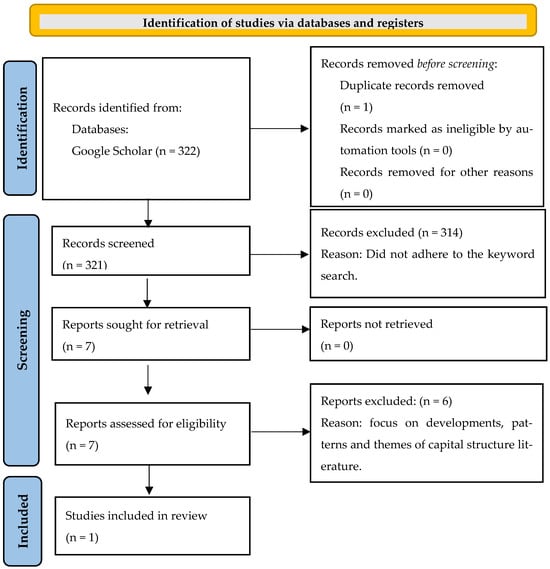 As indicated in bold, the keywords “review” or “meta” combined with “capital structure” were deemed appropriate. One duplication was detected in the 322 citations identified on 29 November 2023. The same article was cited by both Articles 1 and 2. Therefore, the titles of the reduced list of 321 cited articles were scanned for the identified keywords. Seven articles were identified after 314 articles were excluded. These seven articles were then submitted for further investigation by reading the abstracts and scanning the articles. The results of the PRISMA approach followed for the citation analysis are shown in Figure 3.