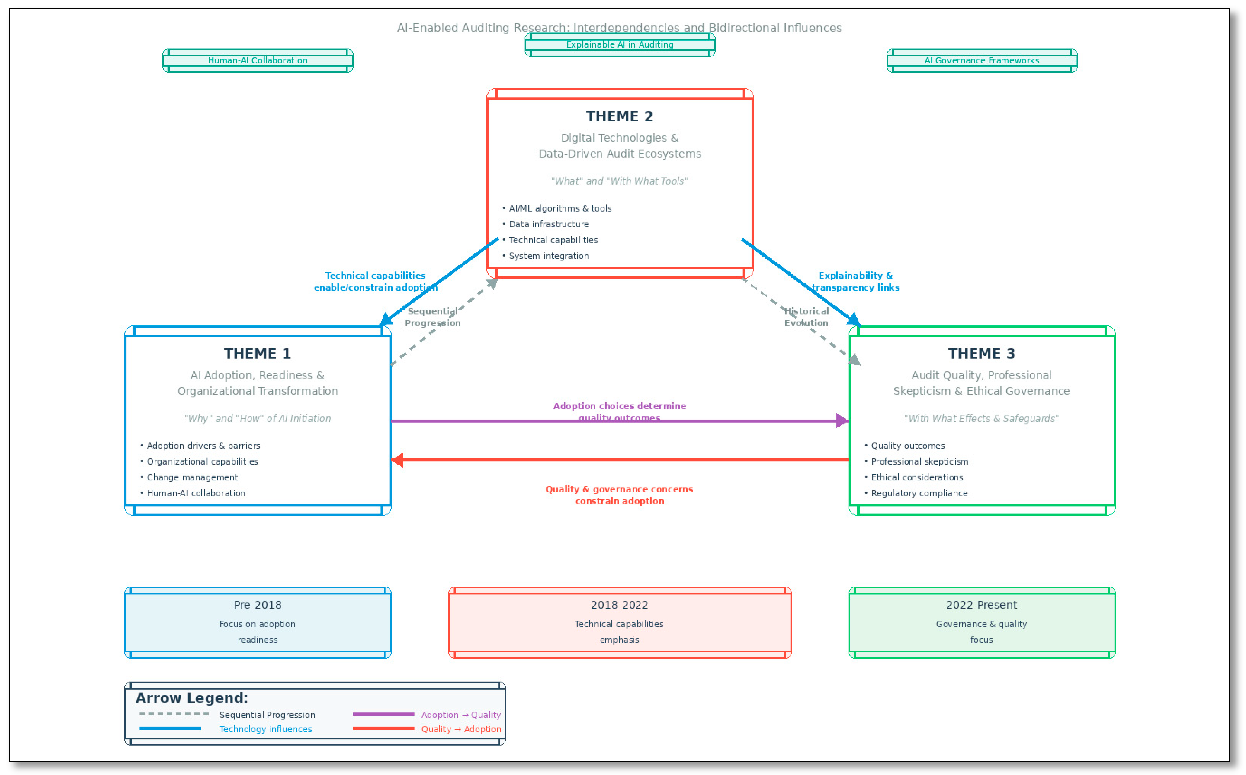 | Han et al. (2023) | AI–blockchain convergence improves transparency and fraud detection; empirical evidence remains limited. | Maps synergies and gaps at the intersection of AI and blockchain in auditing. | Theme 2: Digital Technologies & Data-Driven Audit Ecosystems |