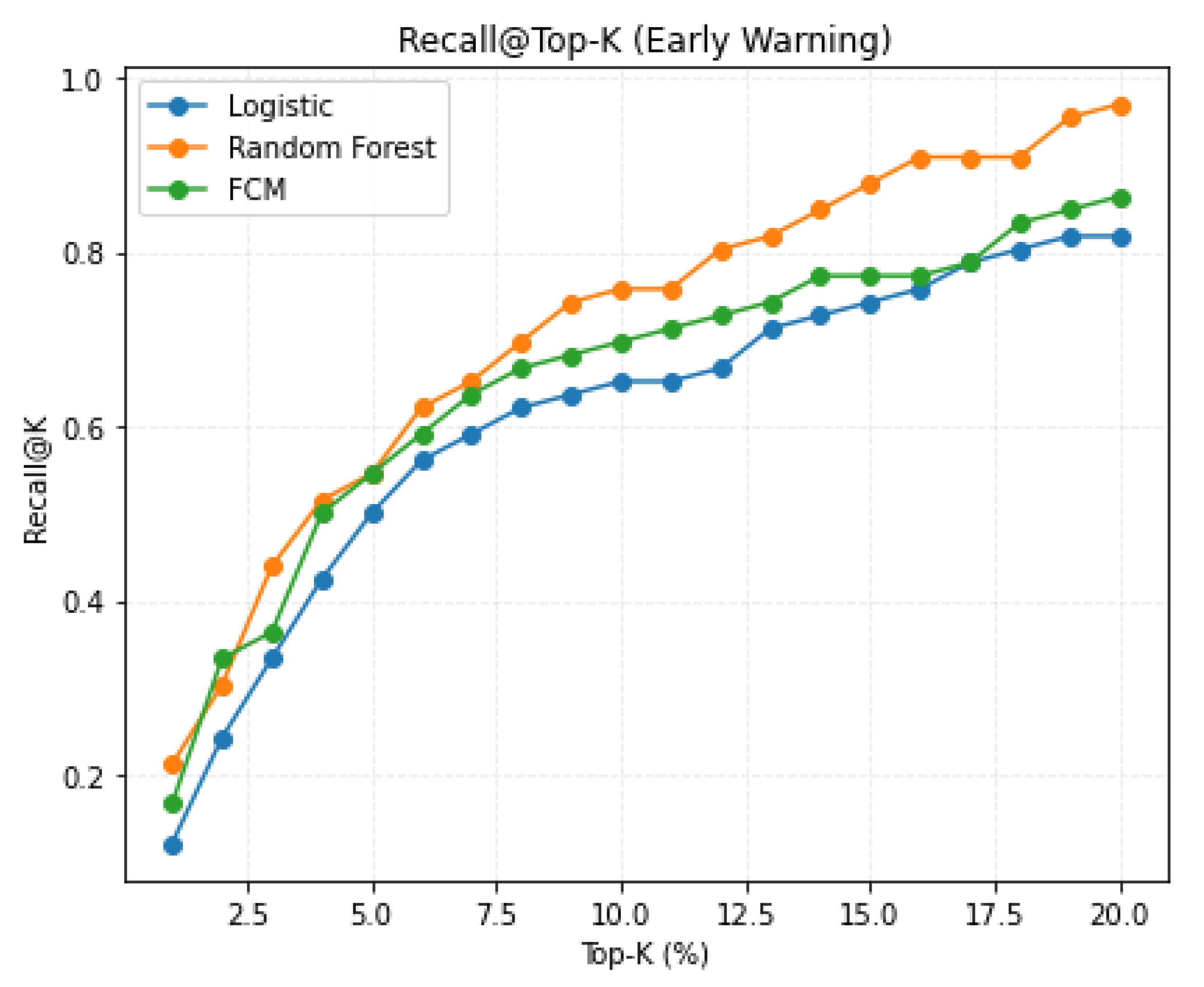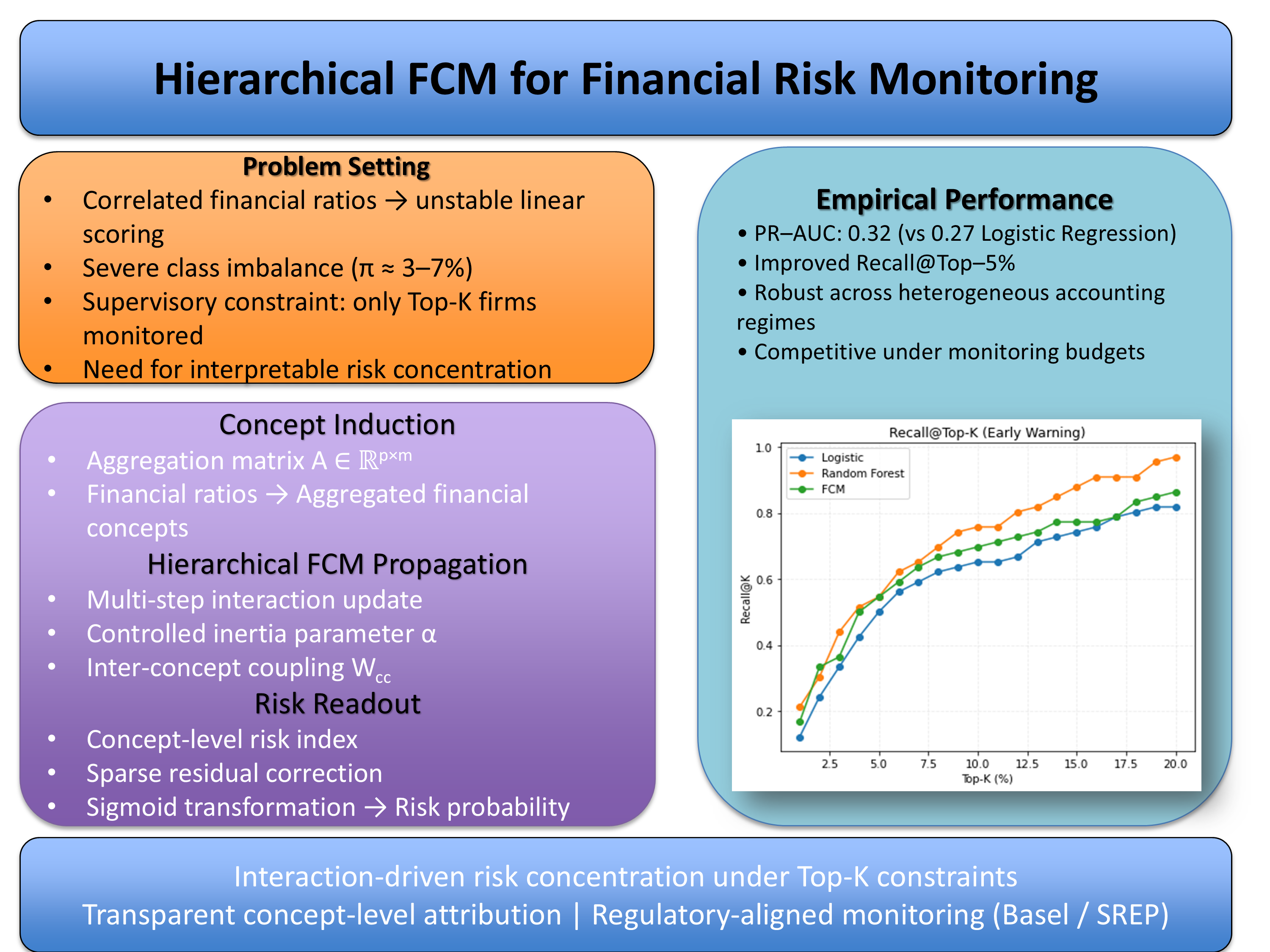 K, which measures the proportion of distressed firms captured within a predefined monitoring budget (e.g., Top-10%). Unlike threshold-dependent metrics, Recall@Top-