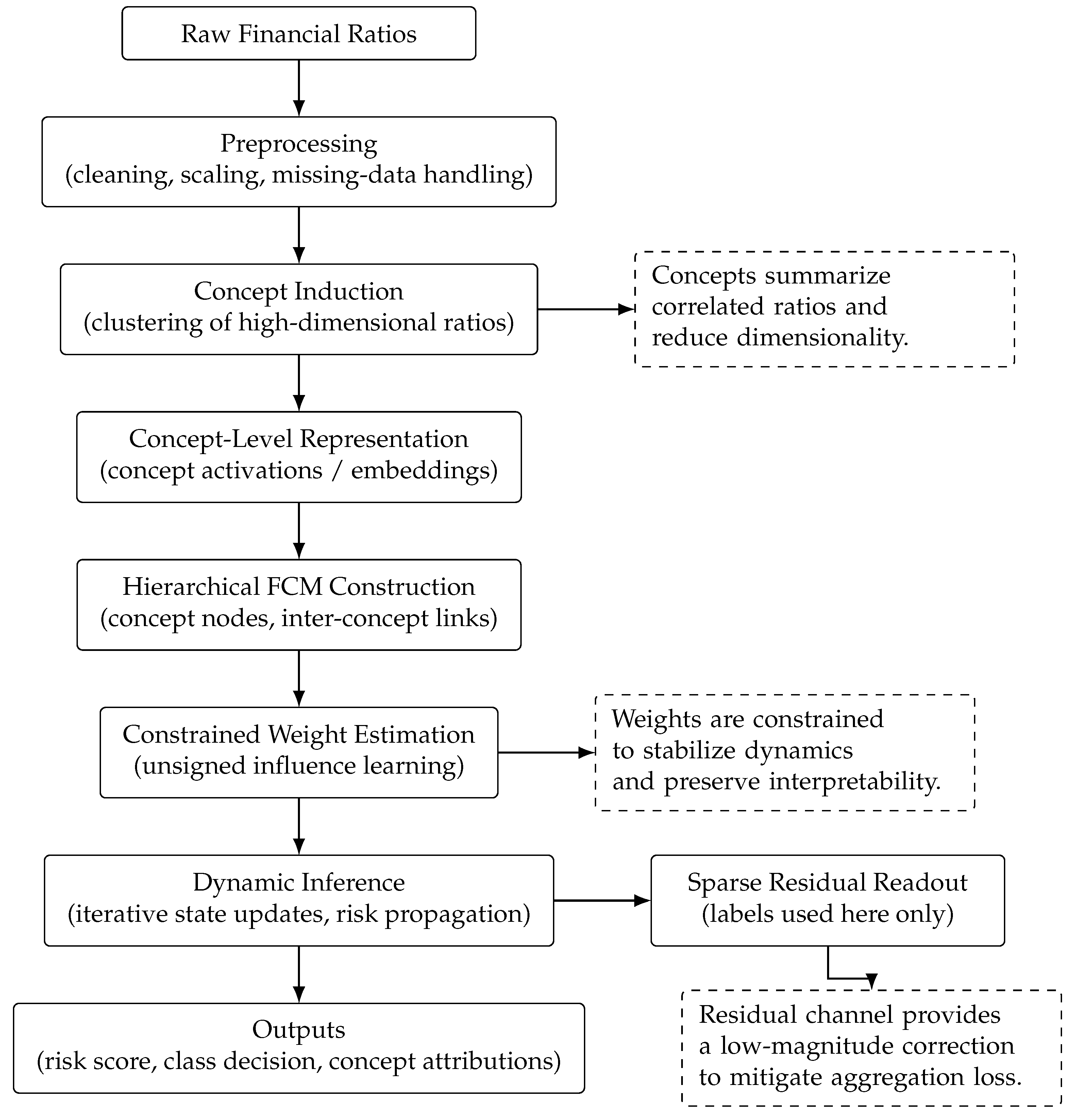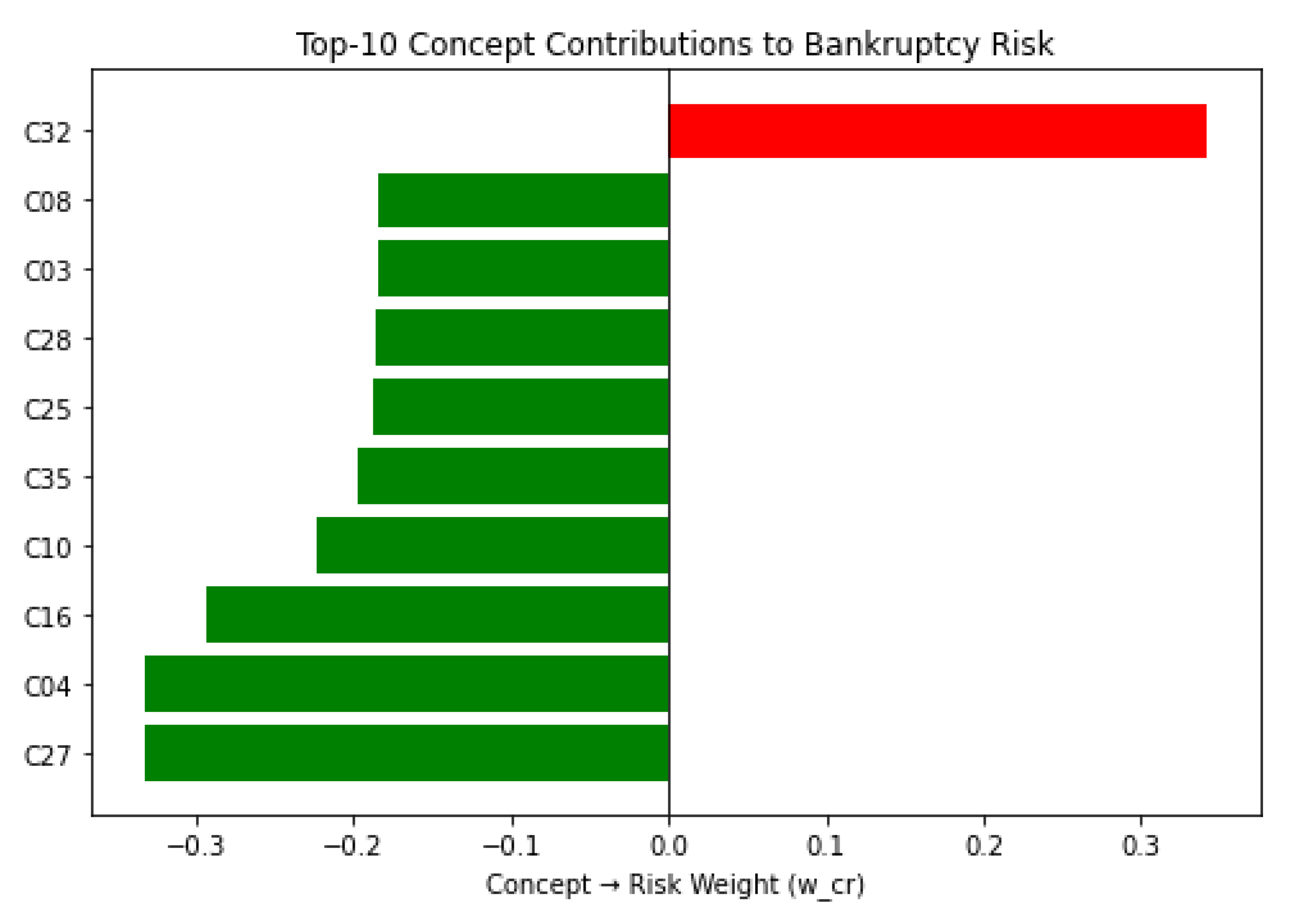 For any unseen firm, all preprocessing parameters, the clustering-derived mapping A, and learned weights remain fixed. The firm is mapped to , propagated to , and assigned the risk score r. Interpretability is supported by (i) concept memberships (where ratios define each aggregated concept) and (ii) concept-level contribution through the magnitude of and scenario perturbations at the concept level.