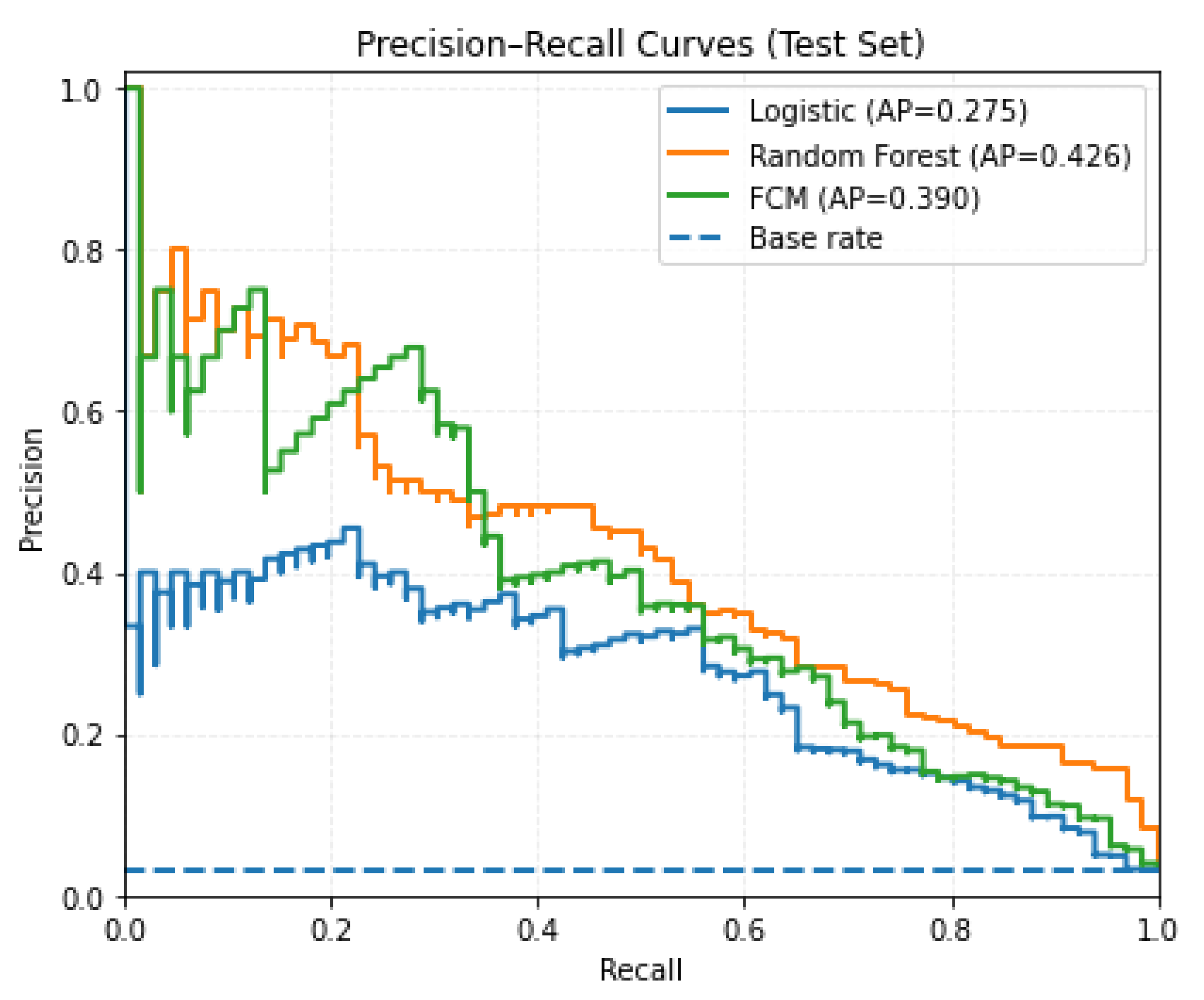 as the decision threshold varies. The ROC–AUC summarizes the probability that a randomly selected distressed firm receives a higher risk score than a non-distressed firm. The precision–recall (PR) curve depicts precision