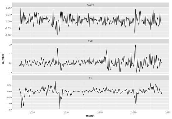 Monthly data on interest rates and exchange rates covering the period from January 2003 to February 2025 were obtained from the South African Reserve Bank (SARB), while closing values for the All Share Price Index (ALSPI) were sourced from the Johannesburg Stock Exchange (JSE). This sample period captures a wide range of economic cycles, structural reforms, and external shocks that have shaped South Africa’s financial markets. These include the global financial crisis of 2008, commodity price booms and busts, domestic monetary policy shifts, the COVID-19 pandemic, and the post-pandemic recovery phase. Using monthly data reduces high-frequency noise associated with daily or weekly observations while preserving the medium-to-long-term dynamics relevant for macro-financial volatility analysis. Figure 1 and Figure 2 illustrate the behaviour of the log-level series and their corresponding return transformations, respectively.