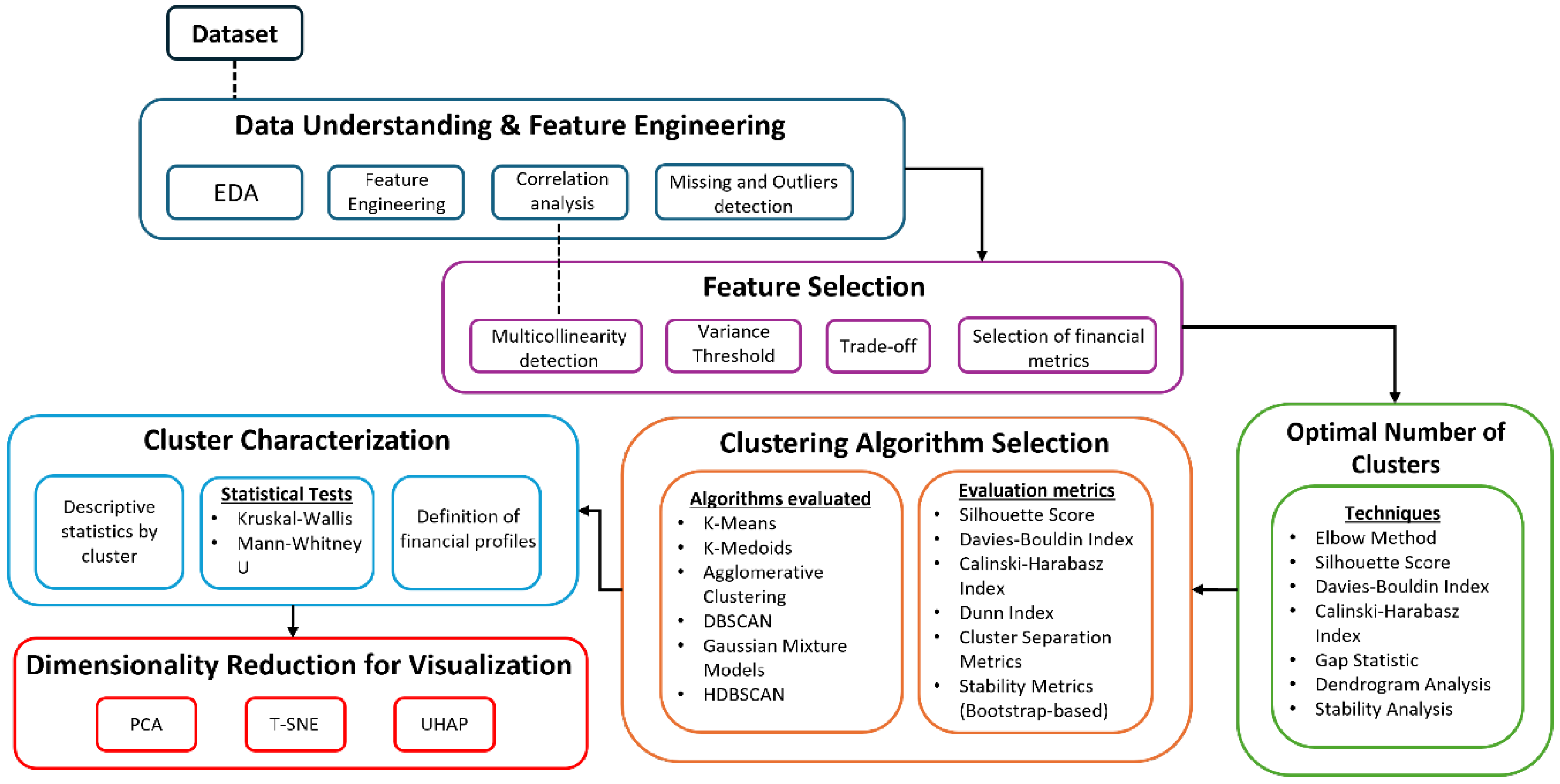 Clustering is an unsupervised learning technique that identifies data patterns and groups them into homogeneous sets according to common characteristics. In the business world, clustering has been used to segment firms with similar financial profiles, facilitating the identification of patterns in variables such as profitability, capital structure, and liquidity that are not always evident through traditional analytical methods (