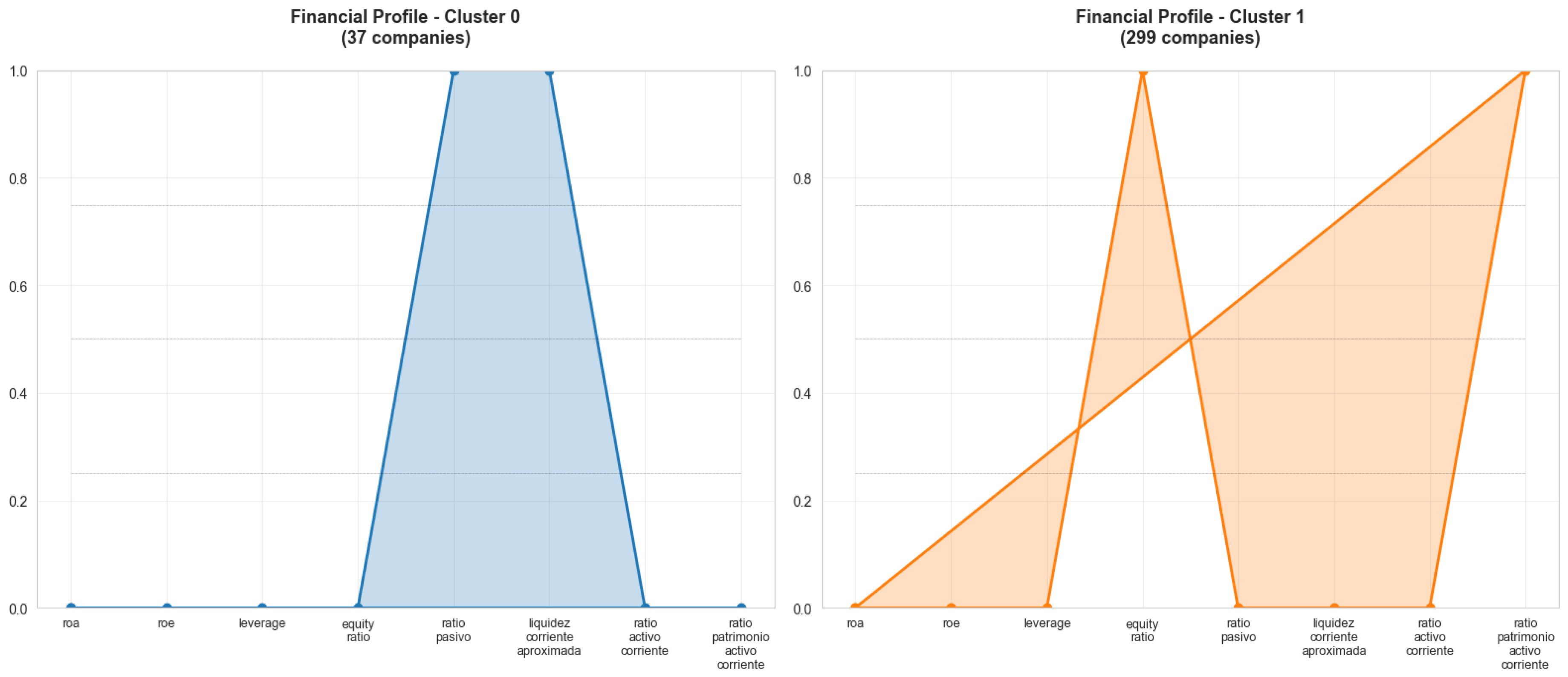 Cluster 0 is characterized by a financial profile with null profitability, absence of financial leverage, and limited liquidity, indicating firms without observable operating activity during the analyzed period. In contrast, Cluster 1 exhibits active financial behavior, marked by high leverage, reduced equity participation, negative profitability, and constrained liquidity, reflecting firms engaged in ongoing operations under financial stress or restructuring conditions.